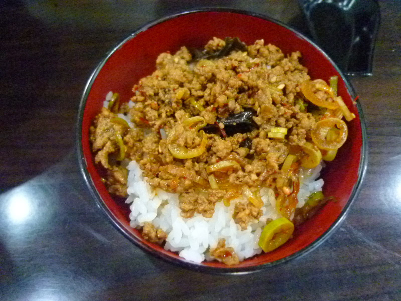 麺を片付けたら穴あきレンゲ大活躍でそぼろご飯。ちょっとスープをかけた方が調子が良いカンジでした。おなかいっぱい!