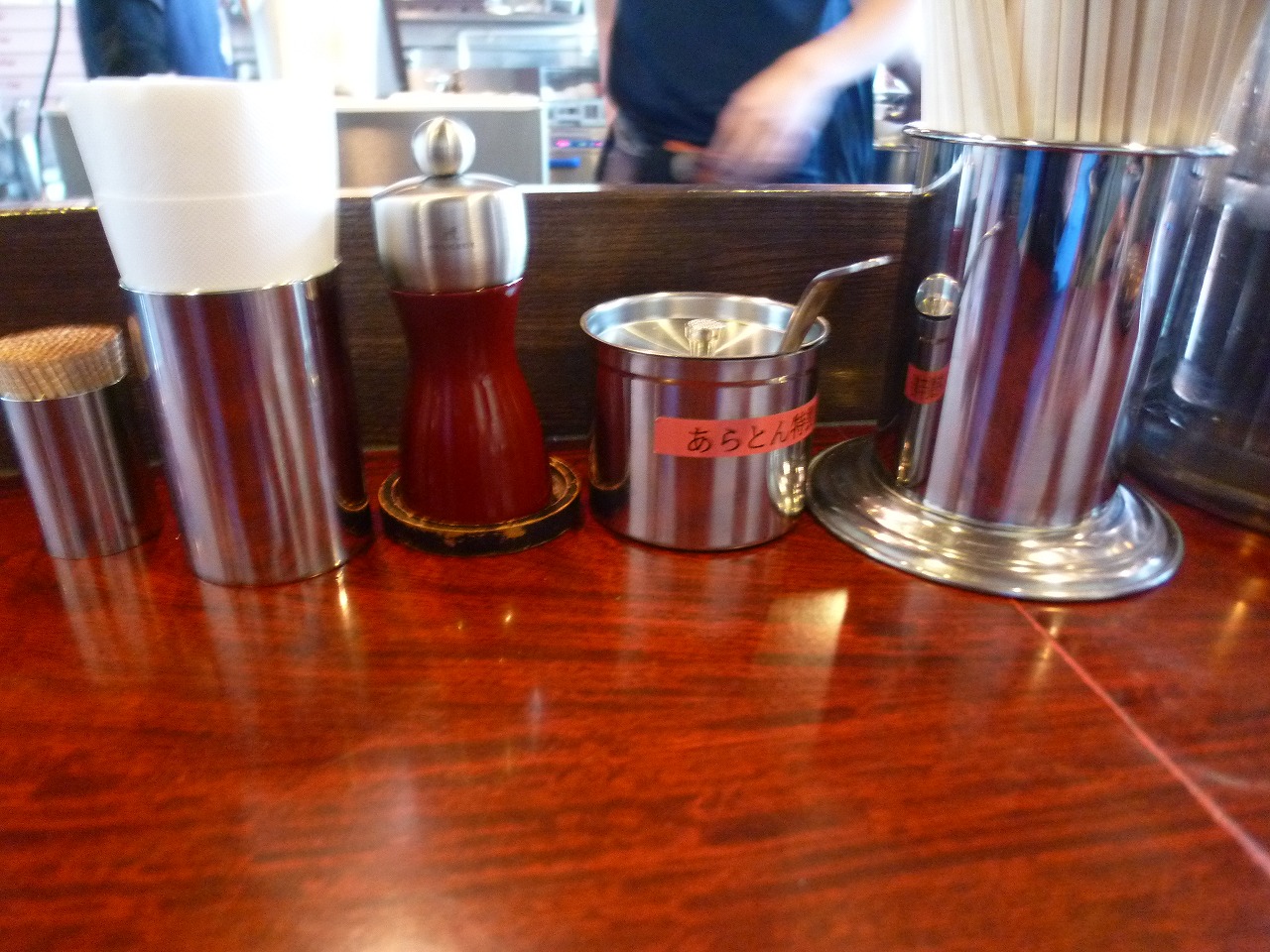 卓上にはペッパーミルに魚粉と唐辛子を合わせた特製辛味。