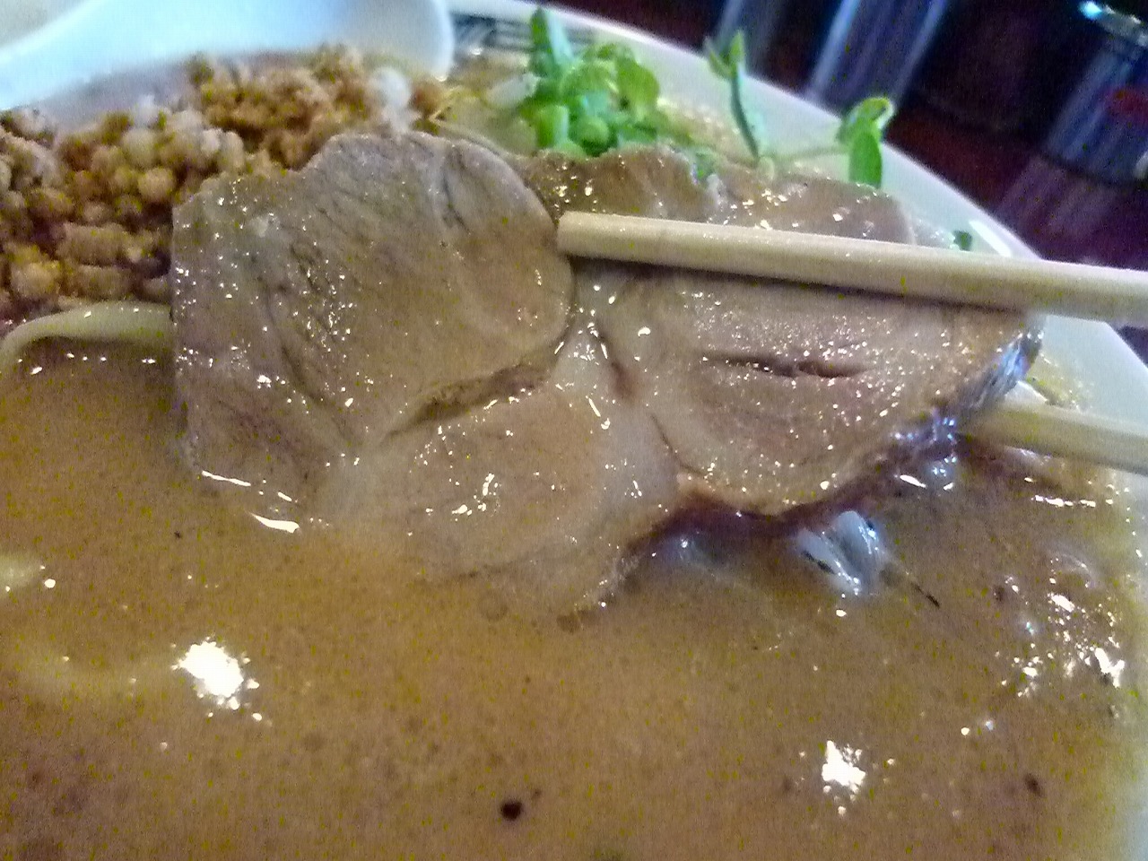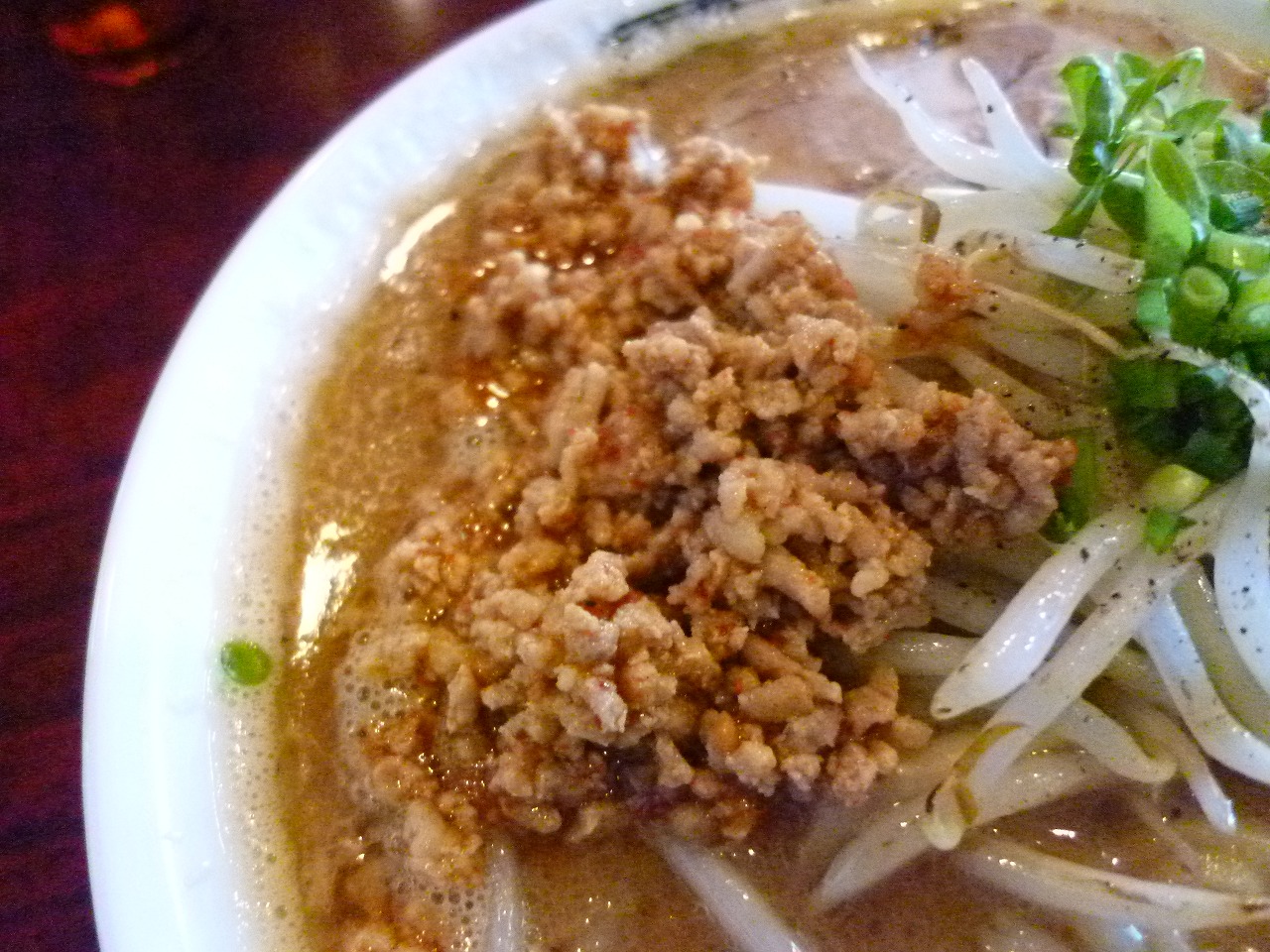 なかなかに立派なチャーシューが入りますが肉味噌も。ちょっとピリ辛で濃いめな味付けがされていてそのままではちょっとしょっぱいくらい。これが混ざるとスープがとてもいいカンジになります。肉味噌も含めてスープと考えても良いかも。