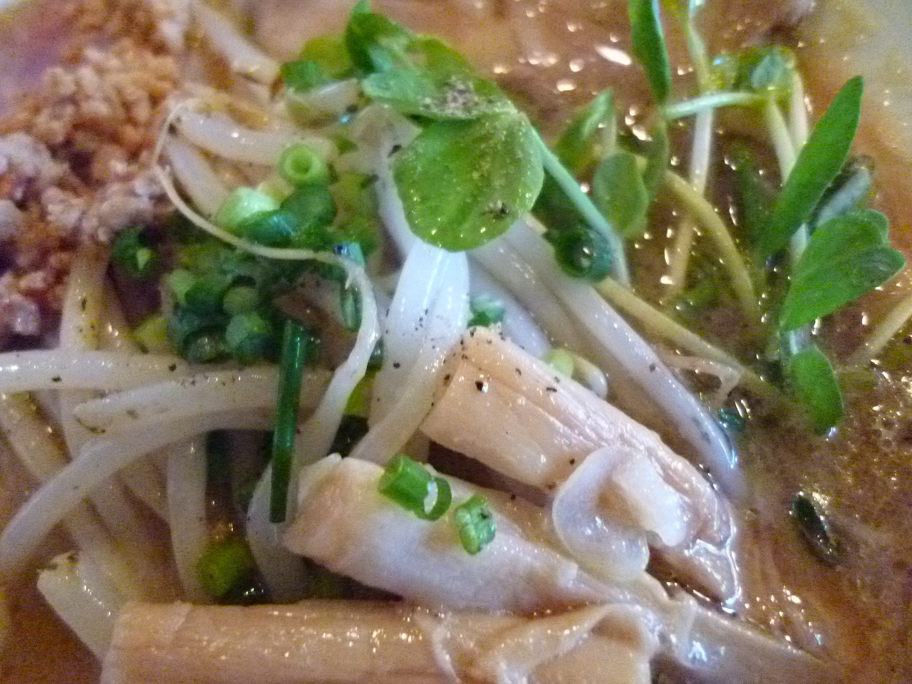 野菜は鉄鍋炒めでスープとは合わせないためスープに影響は与えませんが胡椒の利いた香ばしい野菜炒めはカイワレと共にとても良い舌直しになります。極太メンマも薄味ながらサクサクジューシー。