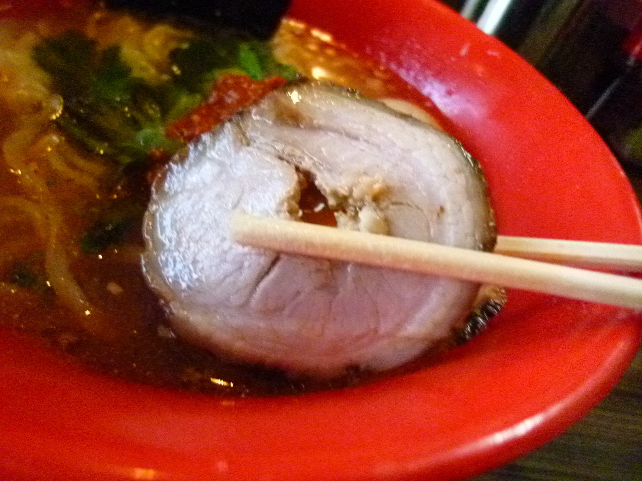 チャーシューは脂身の少ない巻きバラの厚切りが2枚。若干の歯ごたえを残してあって肉の旨さもわかります。