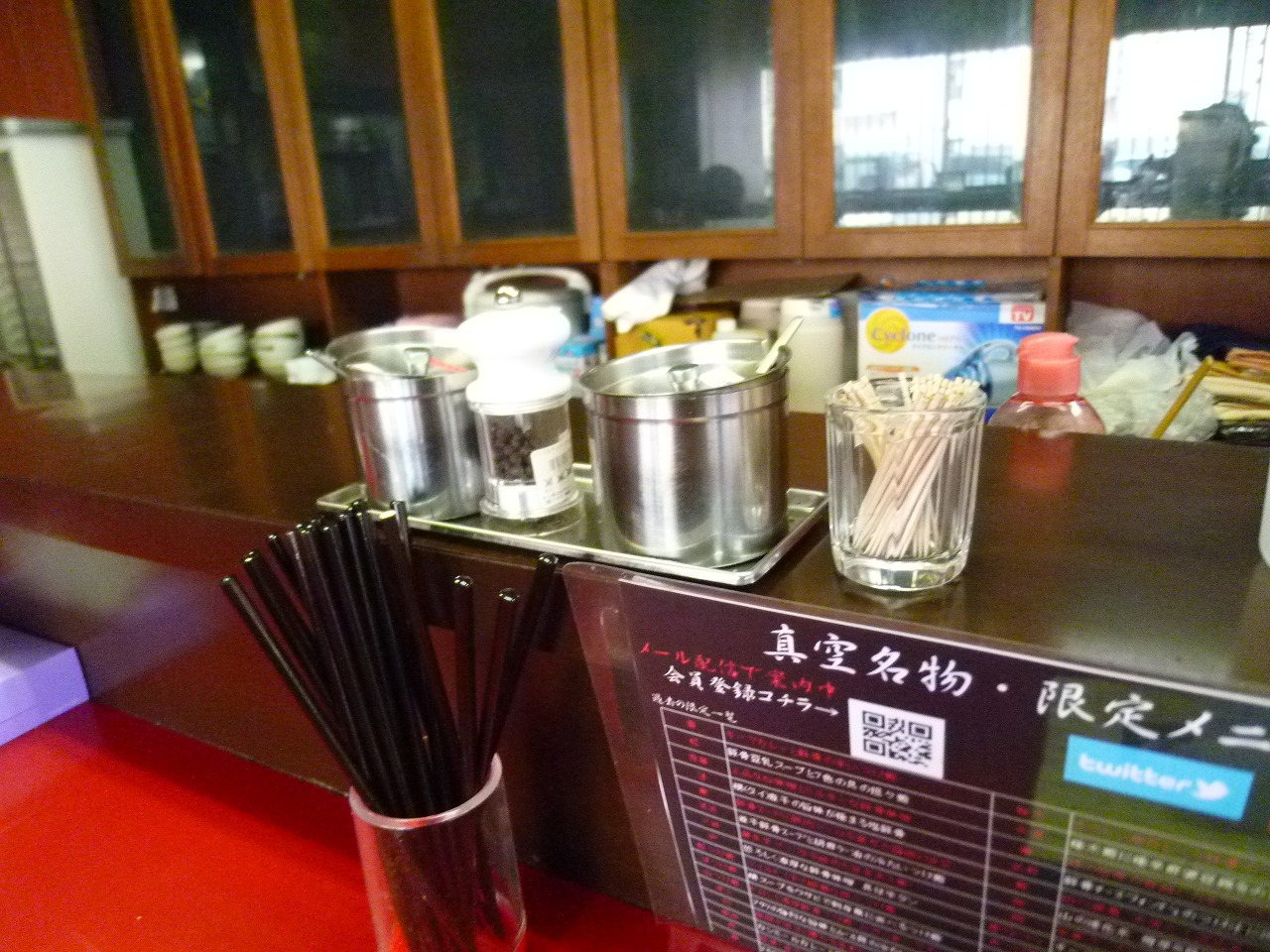 調味料はカウンター台の上に。手前はガツン汁と書いてありましたがどんなんだろう。
