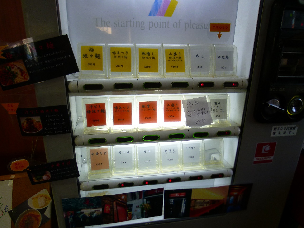 入って右手にある券売機。九頭竜からの居ぬきのようで同じ場所にありました。坦々麺に汁なし坦々、あっさり系なのかな、中華そばもあります。おそらくはもう始まってると思いますがつけ麺や坦々ゴマ鍋を始めるとの告知が。