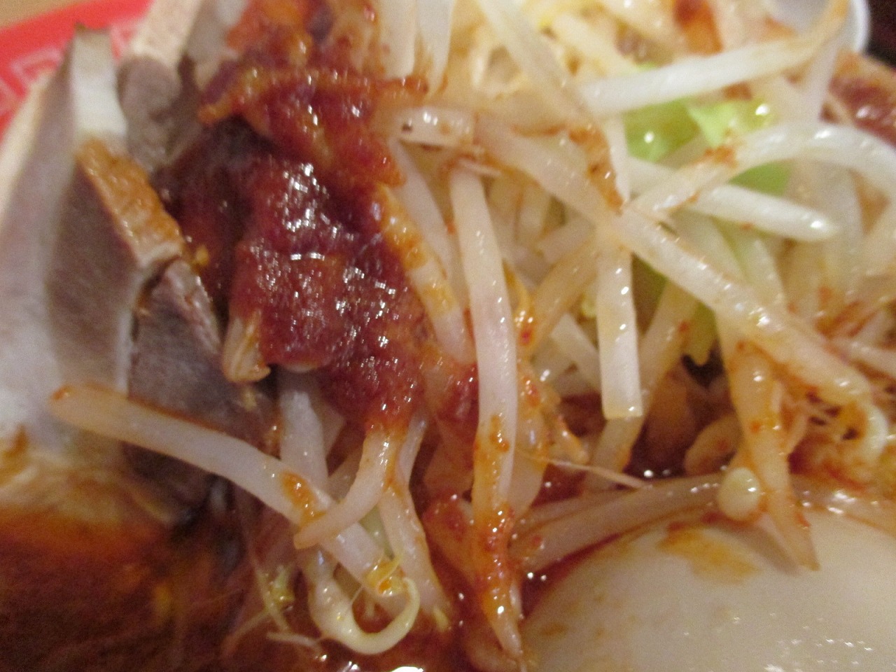 こんもり野菜はもやしを中心にキャベツが少々。ぽきぽきもやしにキャベツが甘くていいんですがご丁寧に野菜にまで辛ダレをかけてくれてるもんだから食べ進めるごとに辛さも加速していきます。辛党にはたまんねえや。