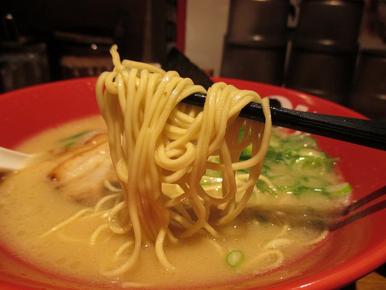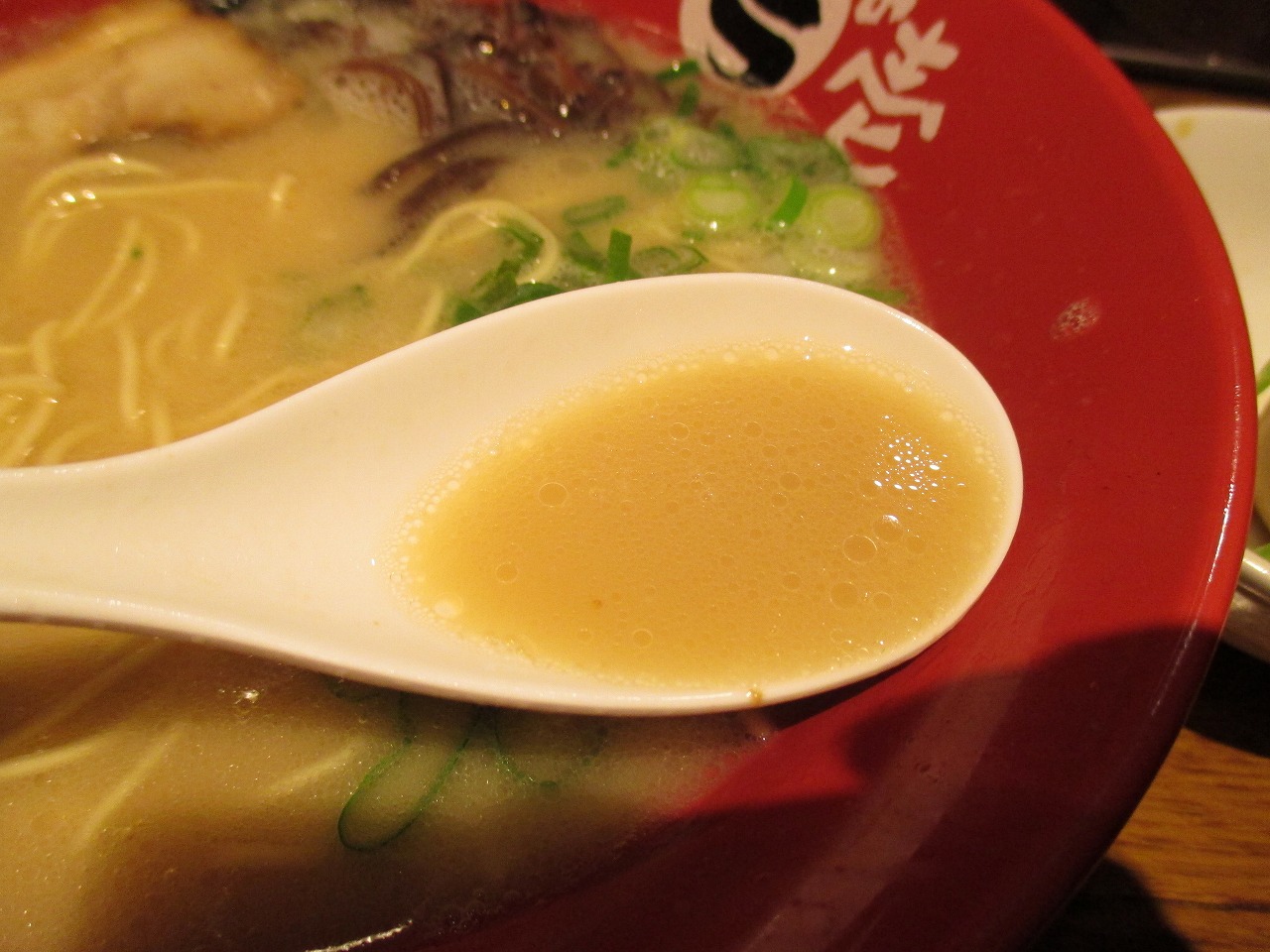 とろりとしたスープはとんこつの髄の部分を感じる濃厚豚骨。臭みのほうは皆無といっていいほどでとんこつの良いところだけをしっかりと炊き出したように感じます。一風堂よりも濃度が高いんじゃないかな。こりゃ旨いわぁ。