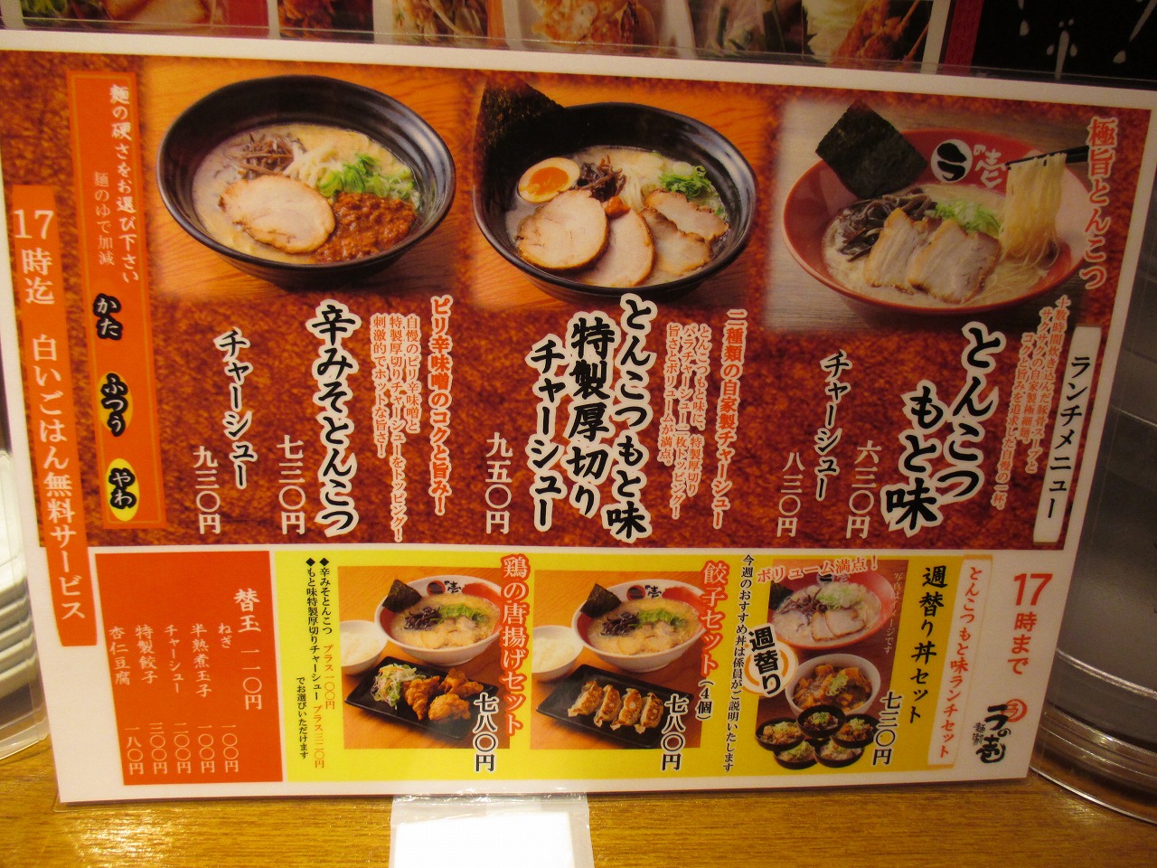メインのメニューは2種類のとんこつラーメンにつけ麺とシンプル。もと味の文字に見覚えを感じたんですがどうやら一風堂プロデュースのお店だそうです。