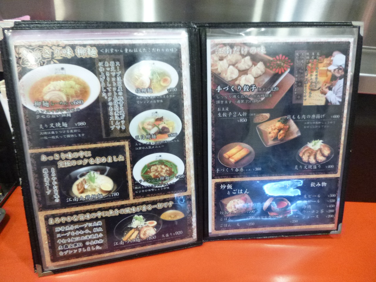 ブックタイプのメニュー。柳麺との字を中てた清湯のラーメンを基本に白湯も提供されてます。根野菜が入った一口餃子も自慢だそうで。増税前のメニューですが場所柄を考えれば良心的ですかね?