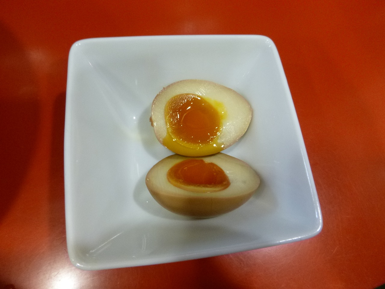 別皿提供の味玉は白身の水分が抜けて固くなるくらいに味が染みてましたが半熟加減は上々で。