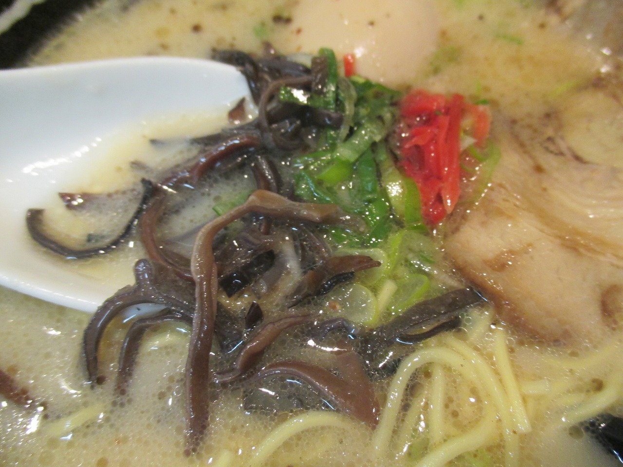脇にはこの系定番のキクラゲにネギは少々。紅生姜は卓上のほうが良さそうな気がしますが、まま、口直しにはなっていました。