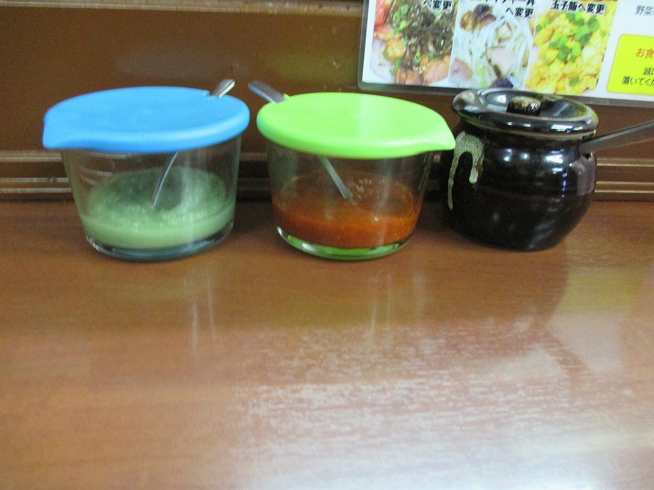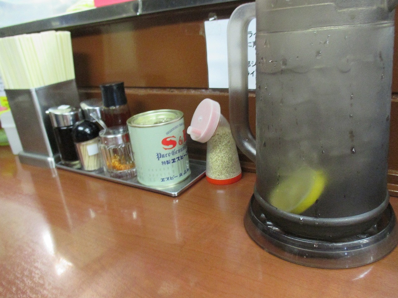 卓上には調味料のほかに高菜や行者にんにくと豆板醤が置かれています。何気に卓上のお冷やはレモン水になっているんで給水機より水差しから入れたほうが良さそうです。