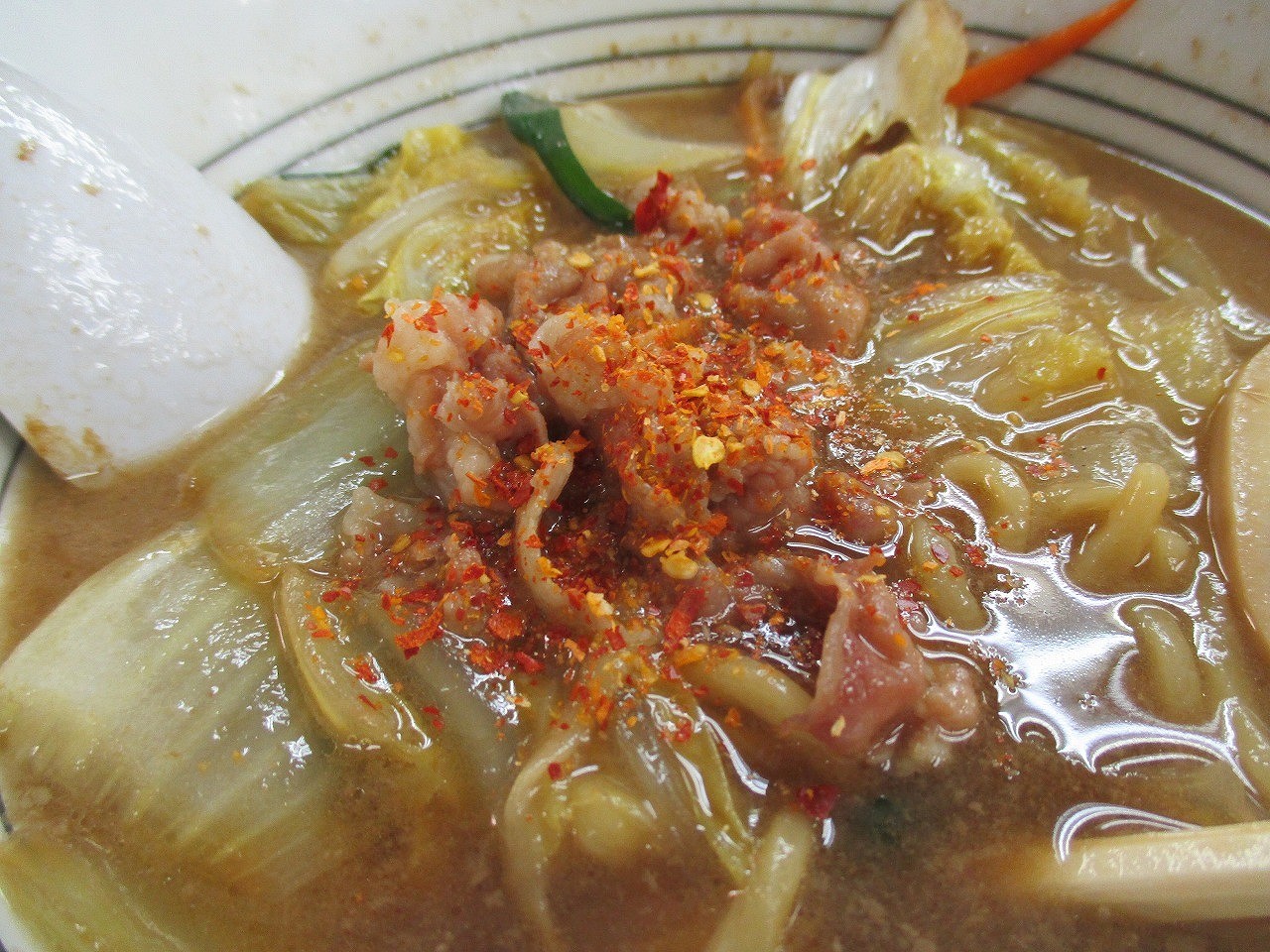 ここは高菜より一味だな、と卓上の種入り粗挽き唐辛子を入れてみましたがこれがどんぴしゃ。