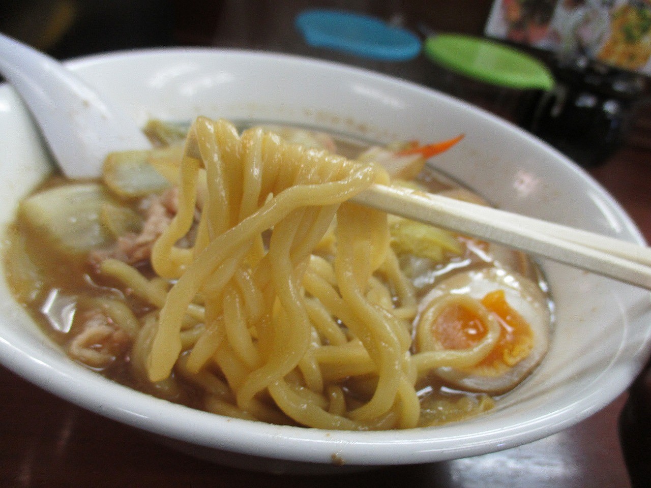 麺は中太やや縮れ。家系メニューに使われる麺ですね。それなりにもちもち感があって具材と一緒に食べても美味しかったです。