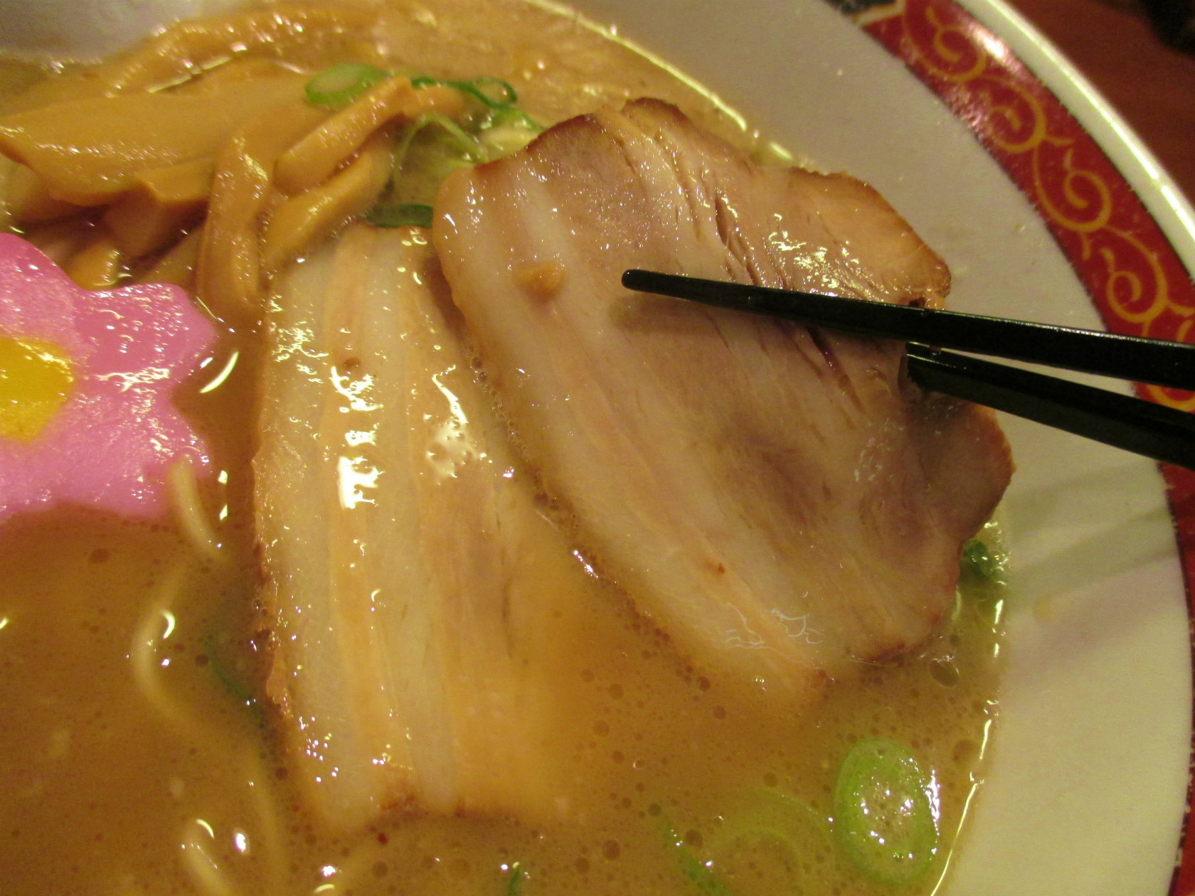 チャーシューは豚バラのスライスが2枚。脂身の甘さを残しつつの煮加減に味付けがきっちりでなかなか。