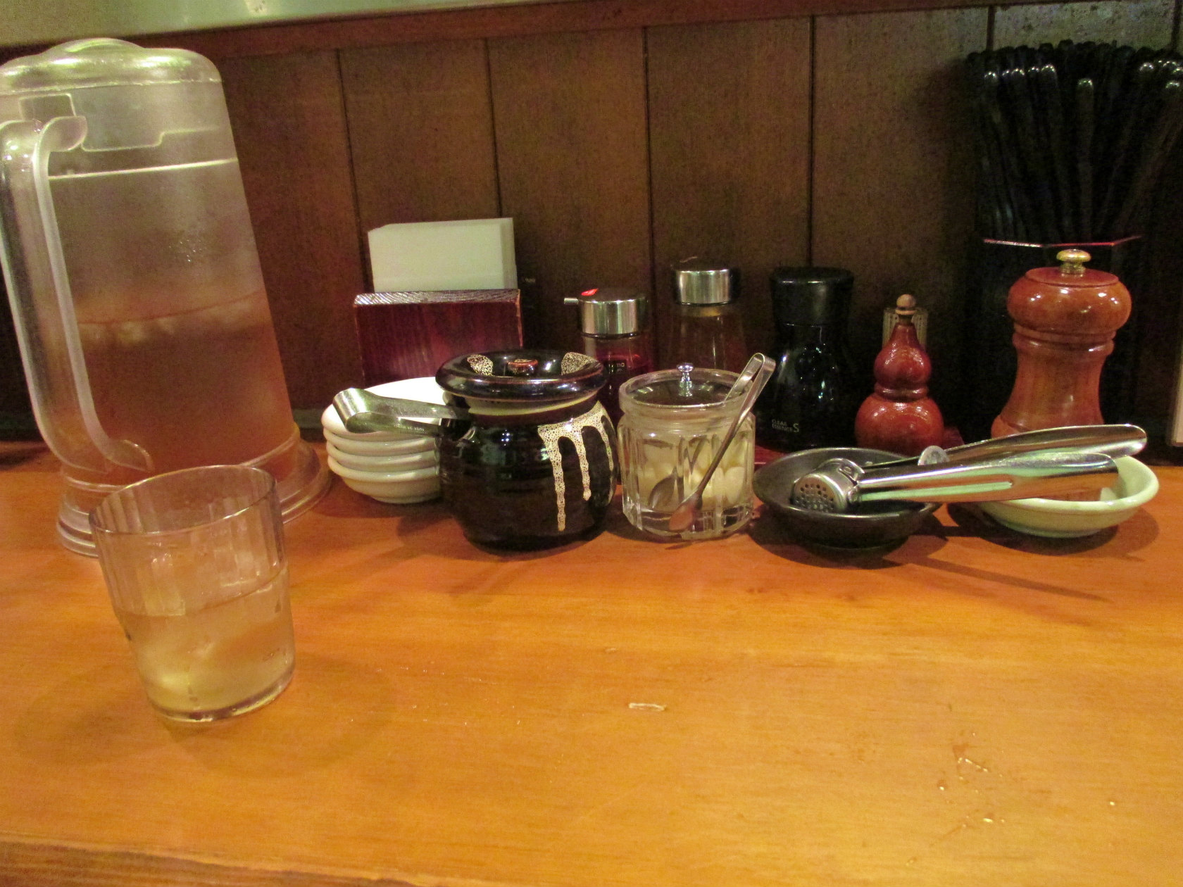 卓上には調味料のほかに粒にんにくと壺の中には小梅が入ってます。