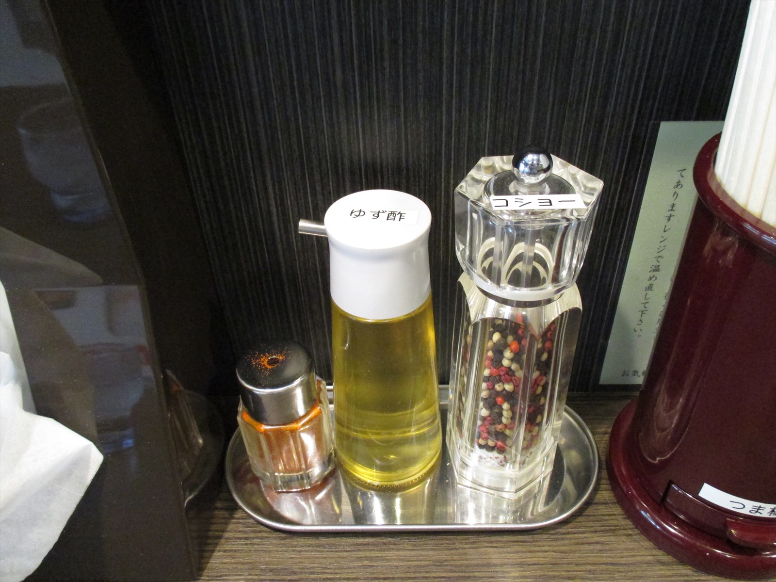 卓上にはペッパーミルと一味にゆず酢なるお酢が置いてあります。