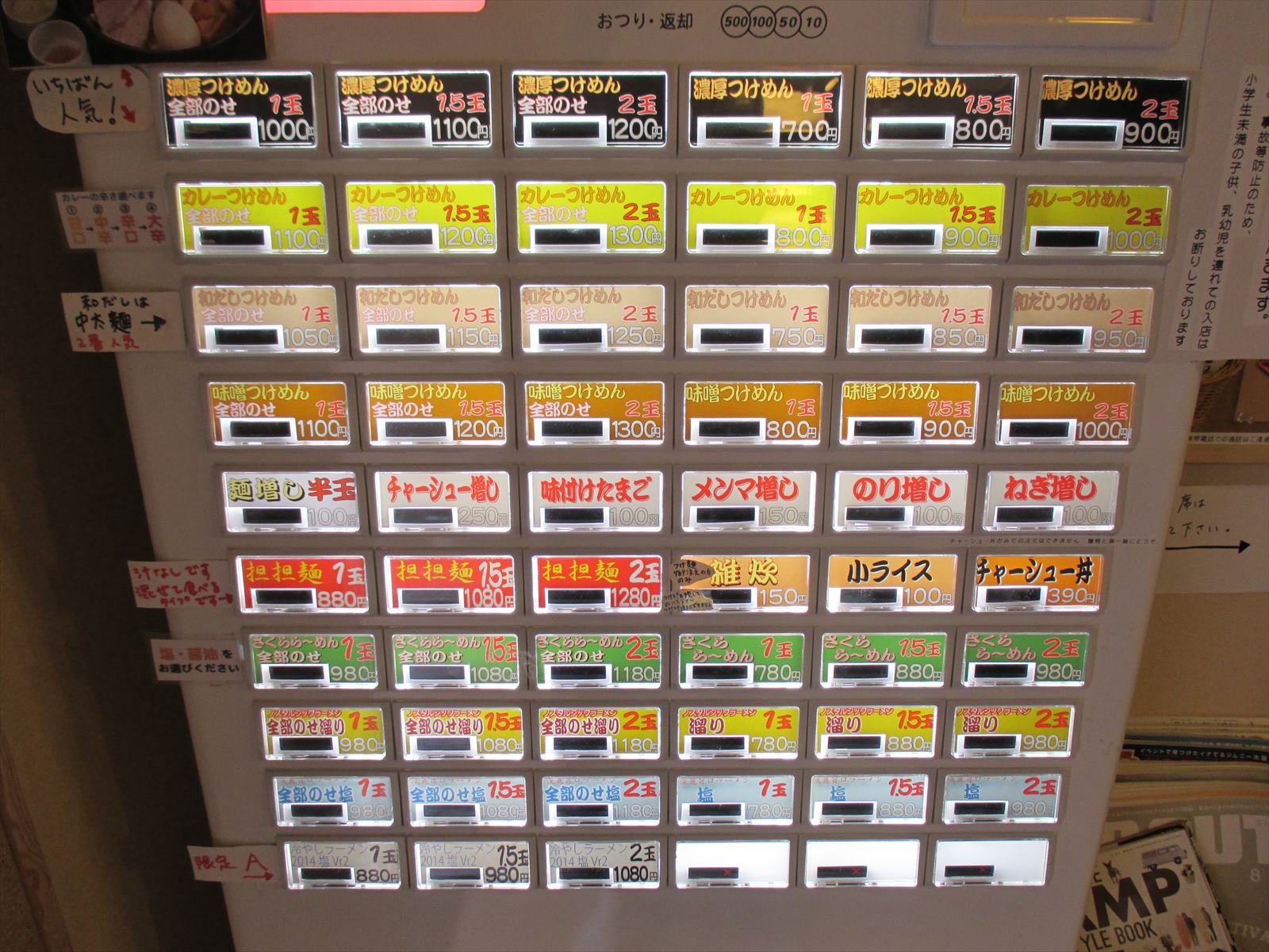 入って左手にある券売機。事前情報では店名を冠したラーメンが出ていましたが配置からすると最大のウリは自家製麺であるがゆえのつけ麺である模様です。それにしてもメニューが多い。