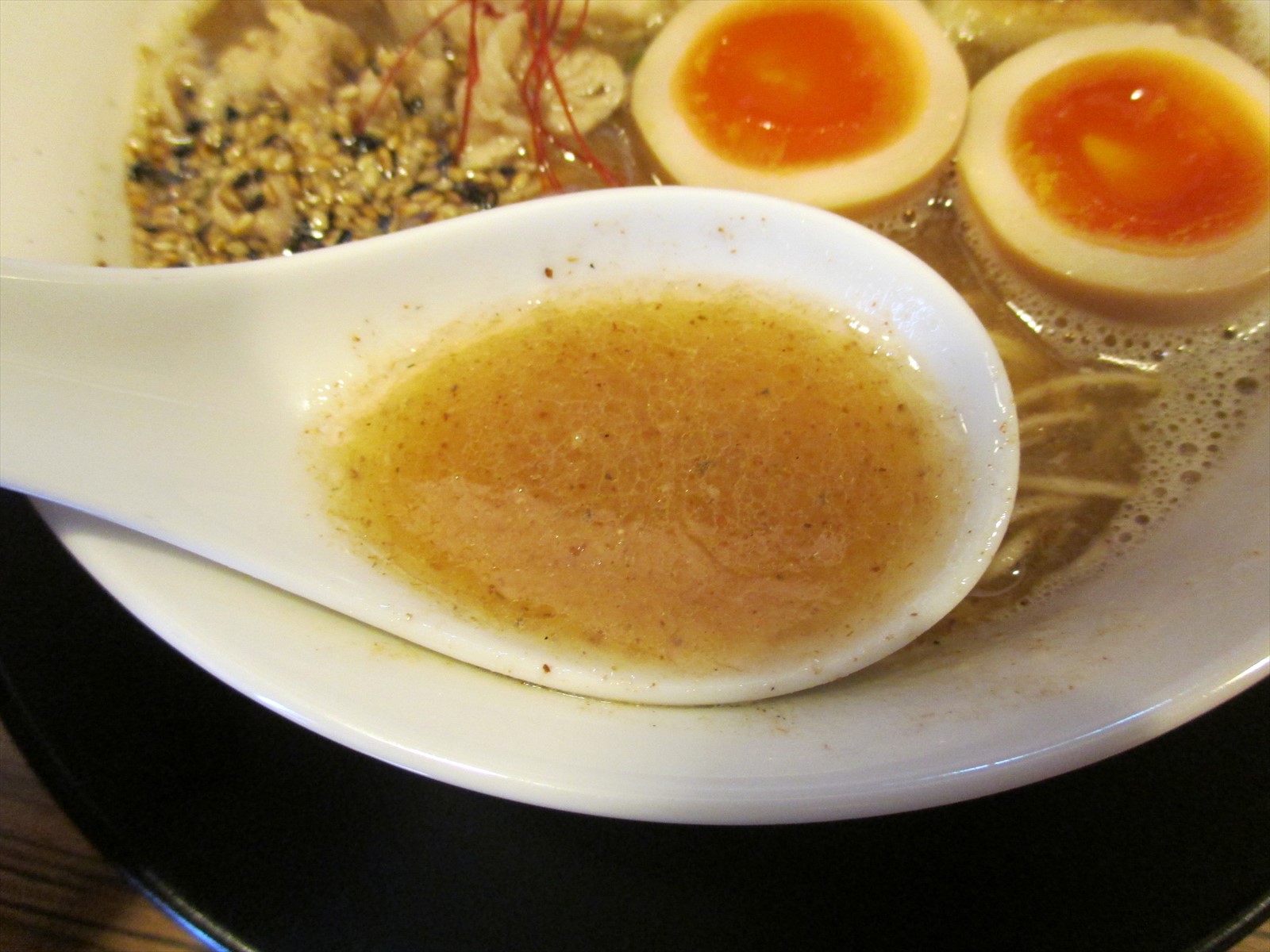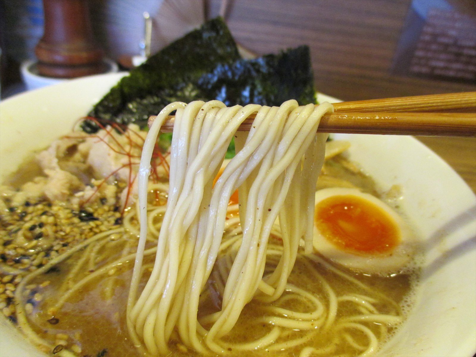 鶏を感じる動物系を土台に節系の魚介。ちょっとざらついた舌触りがあるものの風味は豊かで軽やかな甘みがあります。油が多めなんですが鶏油なのかな、重さは感じず厚みが出ていて白黒のゴマの弾けるような食感と香ばしさが素晴らしいアクセントになってます。