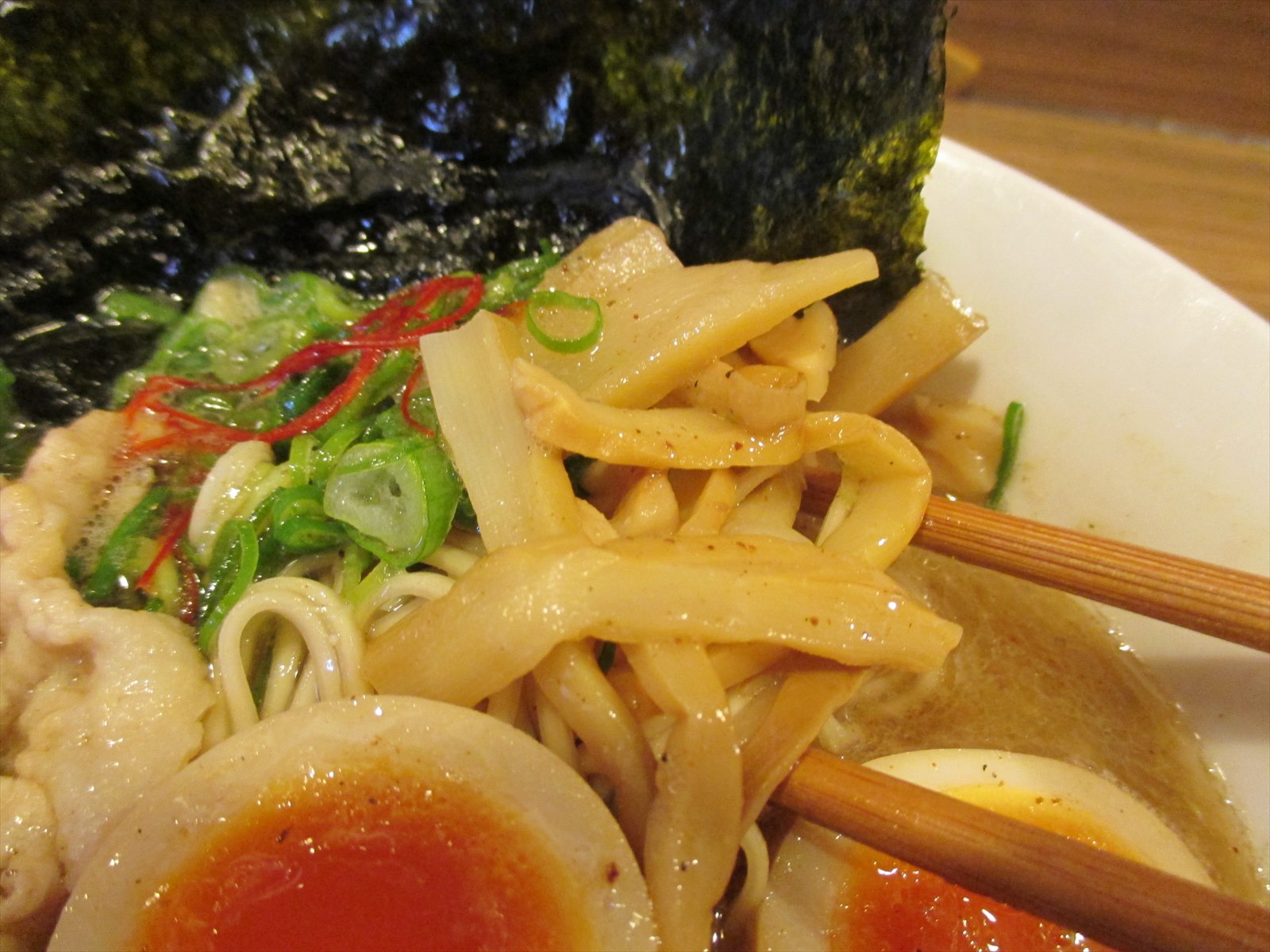 麺は自家製低加水の細ストレート。固すぎず柔過ぎず少し粘りのあるような歯ごたえで肌の粗さがスープを持ち上げてきます。
