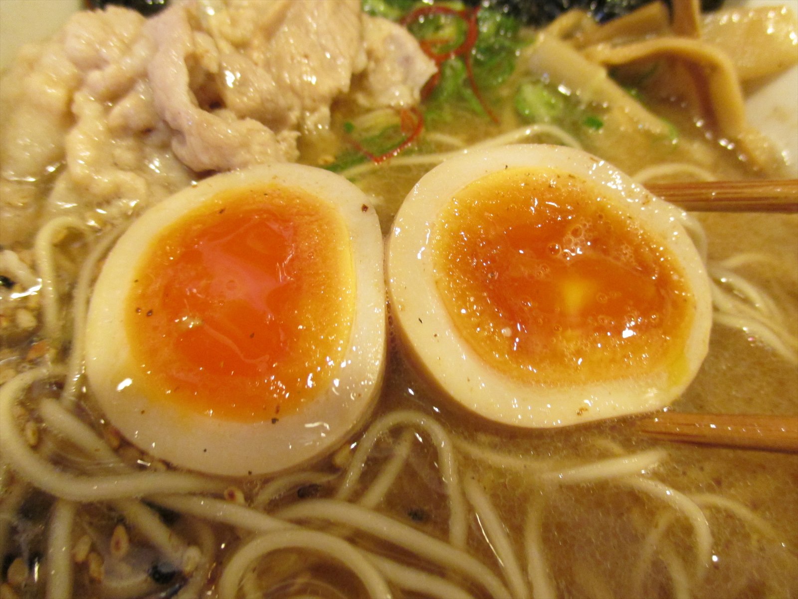 大きな黄身の味玉はとろとろ半熟とちょっと熱の通った黄身の旨さとの両方を備えてます。これまたスープで味付けされてるのか程よい味付けが均一に染みて。