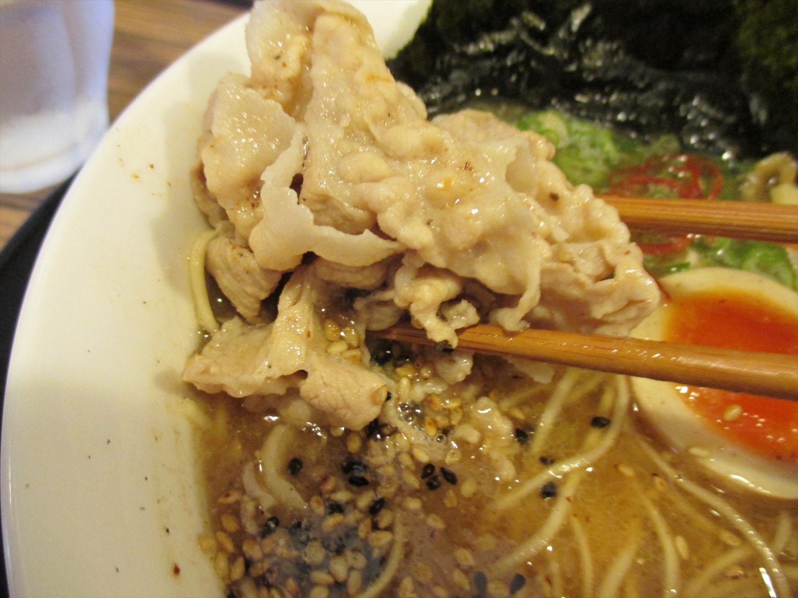 チャーシューは入らずスープで煮たとの豚バラの薄切りが入りますがこれが上品な味付けで脂身が甘く実にウマい。ここにもゴマが絡んできてぷちぷち食感が楽しくて。