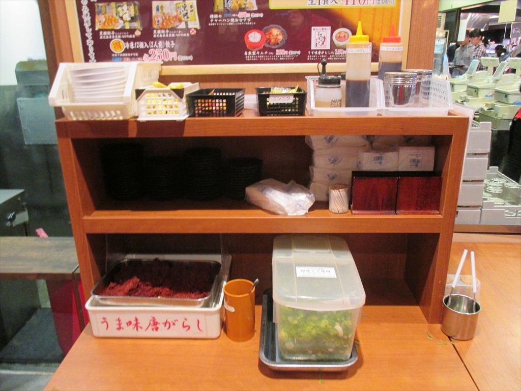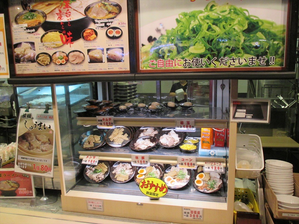 フードコートとしてもラーメン店としては見たことのないセルフサービスでトレイを持って流れながら何を食べるか決めていくことになります。こちらはトッピングのコーナー。こういうのってついついとっちゃうよね。やばいやばい。