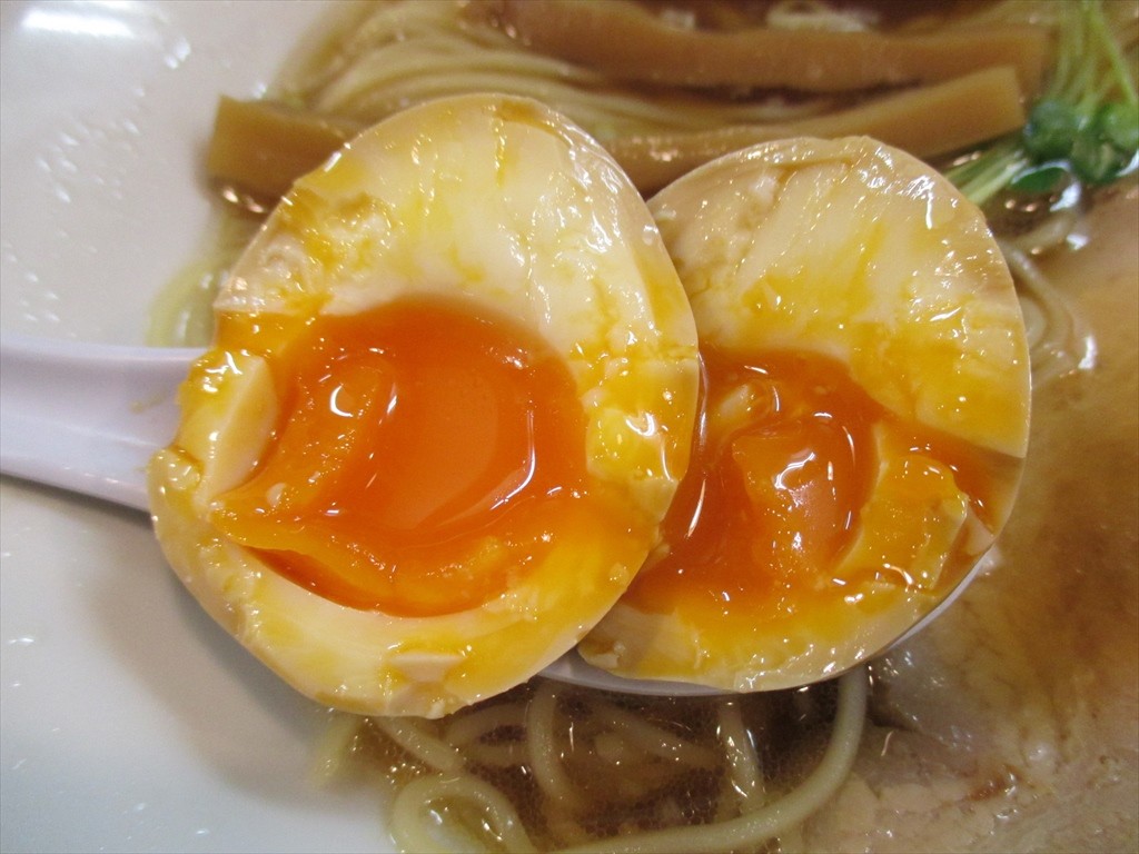 小川フェニックス鳳凰卵使用の味玉。わずかにゆるい半熟加減が大きな黄身の生としての旨さまでも味わわせてくれます。