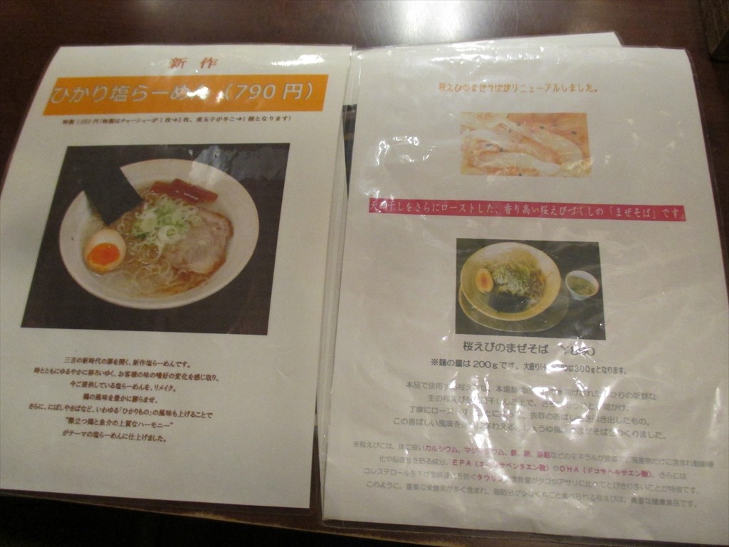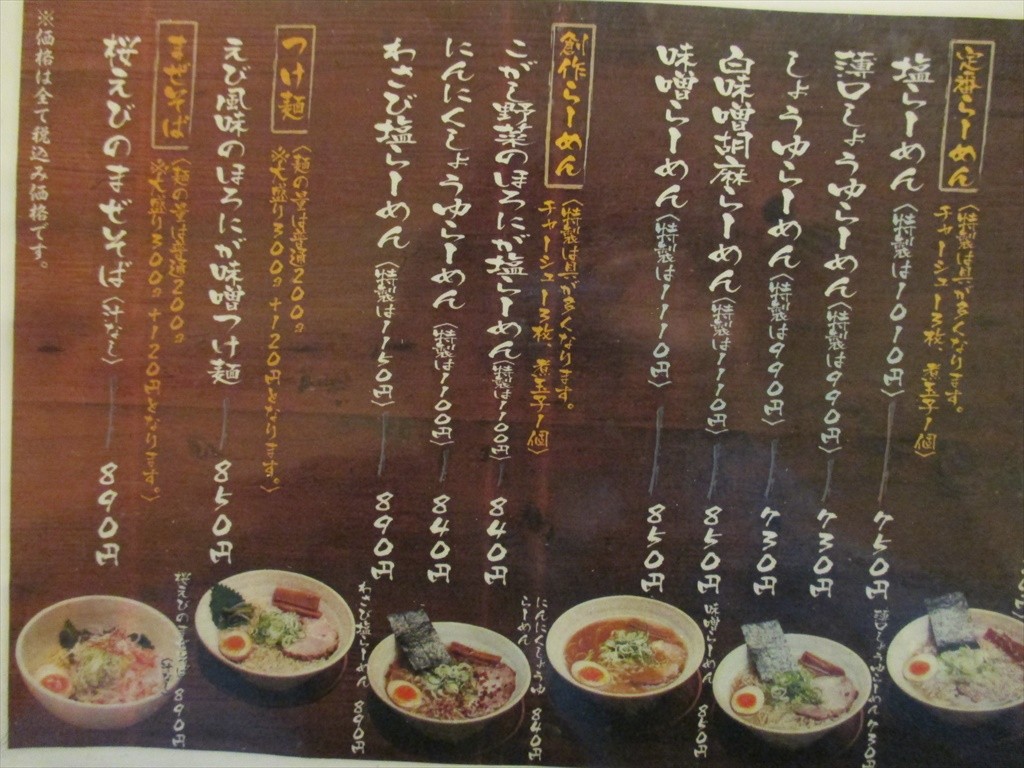 メニューは大きく分けて定番系と創作系のようで。定番系のトップに塩を持ってくるあたりに自信のほどが窺えますが創作系のほうは創作というよりは創意工夫の範疇に収まりそうな気が。事前に調べた限りでは洋の要素を取り入れたラーメンを見ることが出来たんですが他にもメニューあったっけな。