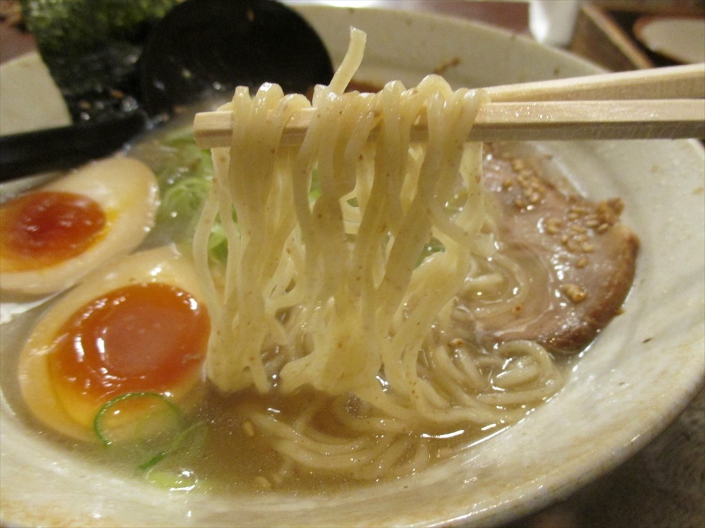 麺は加水率高めな中細縮れ。全粒粉使用のようで細かな斑点が見て取れます。風味の方は濃厚めなスープに隠れてよく分かりませんでしたがしこしことした歯ごたえが最後まで保たれていたのは好感触です。