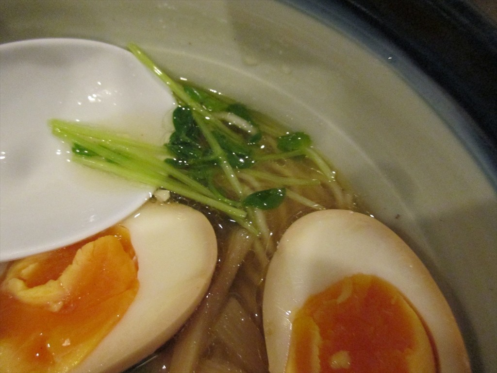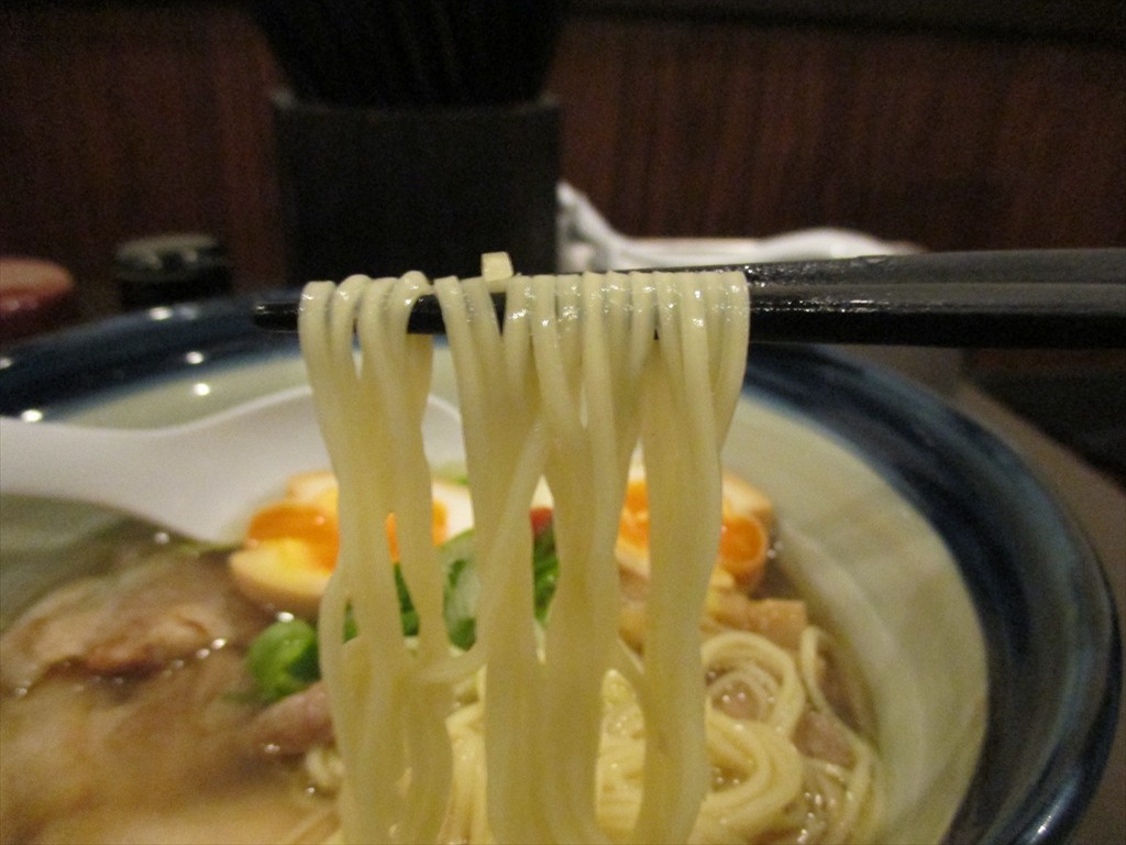 わずかに濁ったしおのスープ。名古屋コーチンや北海道産のサケ節などに塩は紀州梅塩を使ってるんだそうです。サケ節の部分に特に興味を惹かれたんですが旨みの裏に見え隠れする独特な風味がそれなのかな。塩分は十分なんですが口当たりがまろやかで何一つ抵抗するものなく入ってきます。