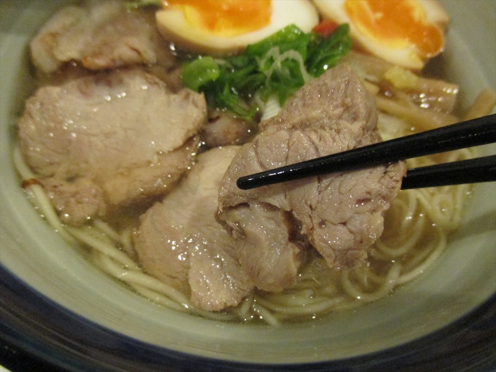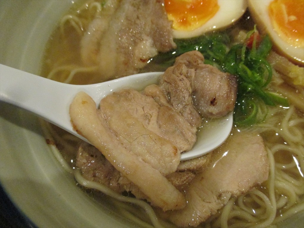 フランス産の希少な豚のソテーを載せたチャーシューめん。しょうゆも選べますがここはしおで。