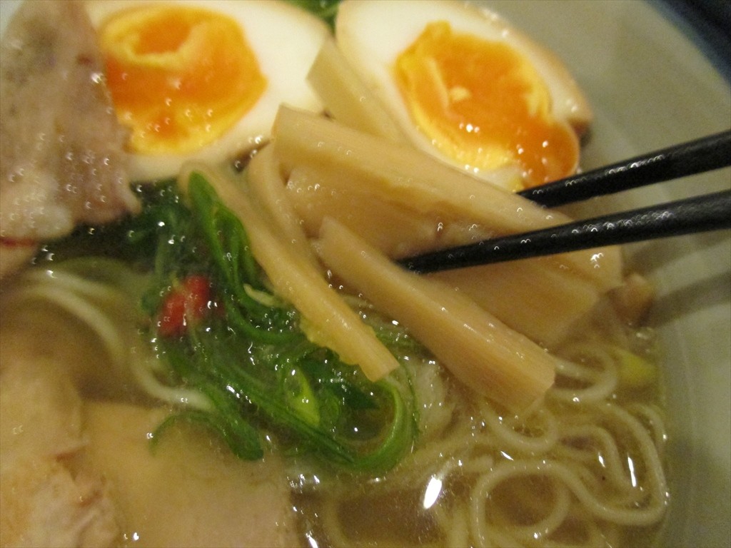 メンマは短く薄味で繊維っぽい食感。ネギの上の赤いのは何だったんだろう、クコの実?
