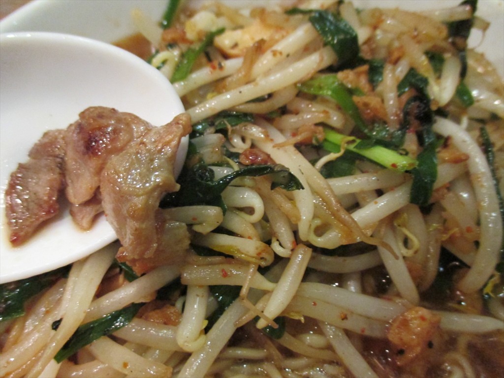具にはたっぷりのもやしとニラにちょこっとオニク。手早く炒められていてしゃっきりした食感が良かったです。ボリューミーではありますがこなれるのも早かったかな。