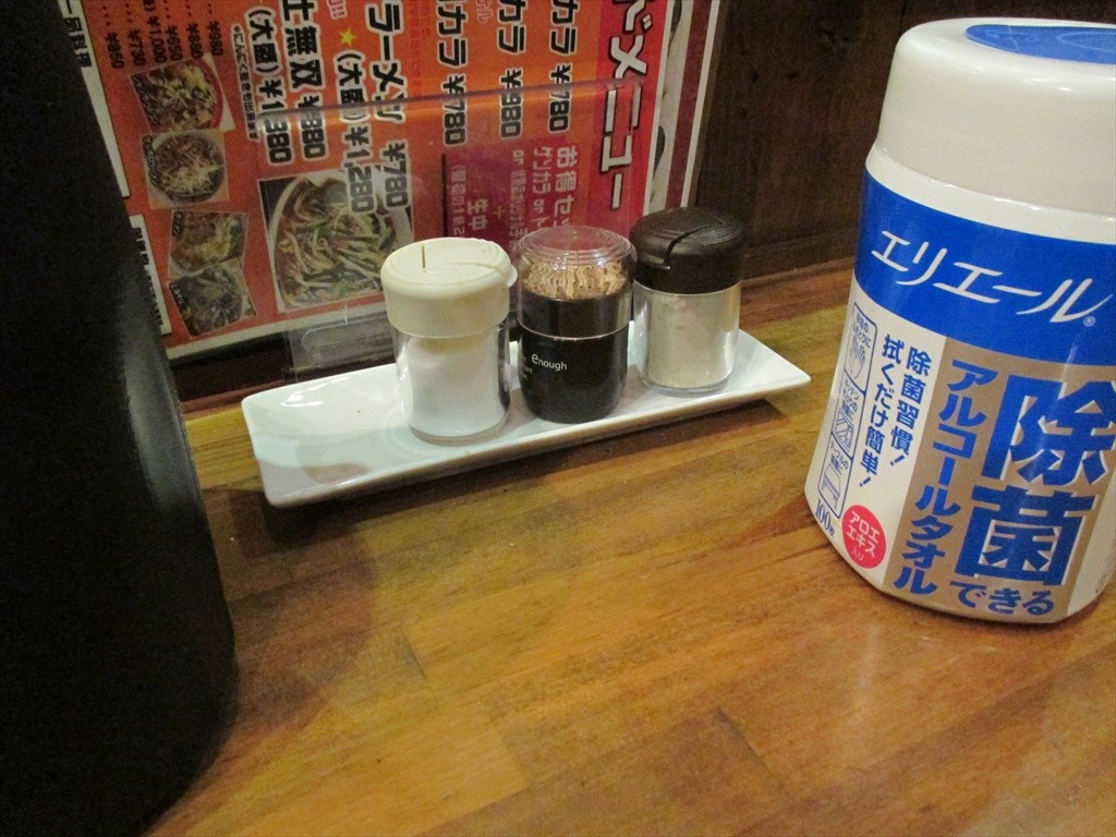 卓上には塩と胡椒。ウェットティッシュが置いてあるのは手づかみメニュー対応なのかな。