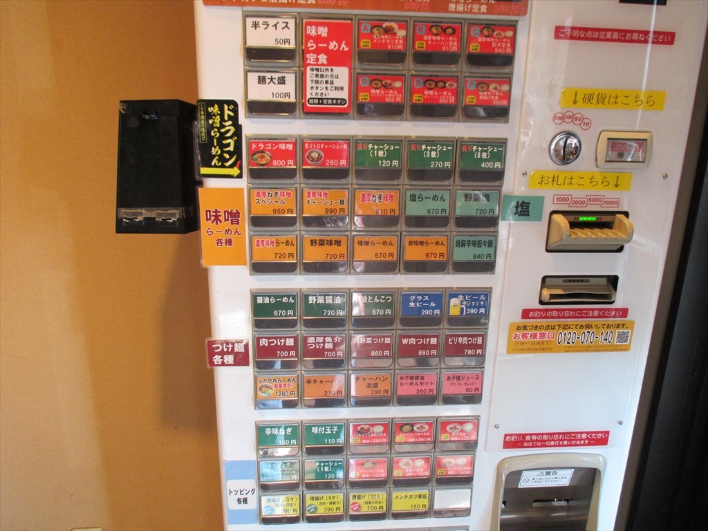 入って右にある券売機。ふかひれラーメンなんてのもあるのには驚きました。需要あるのかな。