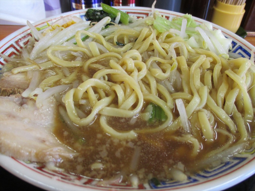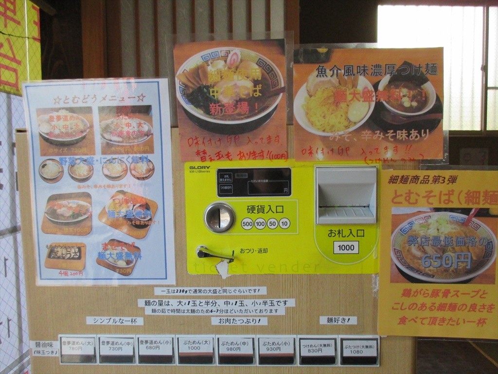入って左にある券売機。店名を冠したメニューは二郎インスパイアになるんですが量の設定は中が基本になるのでコレ系を食べなれた人ほど注意が必要なんでしょうね。ま、普通に考えれば中で230gは大盛り相当なんでしょうけど。