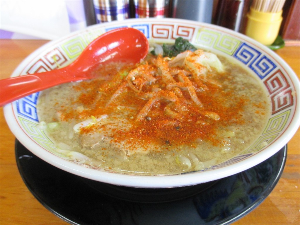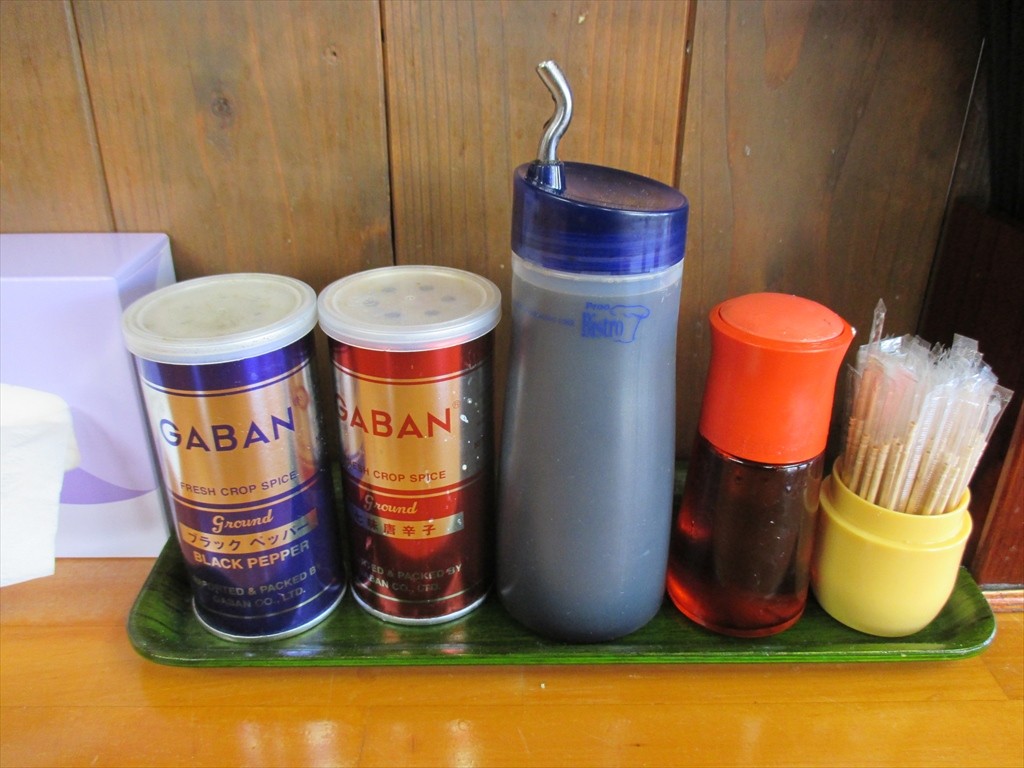 卓上には餃子用に胡椒と七味。あら、一味じゃないんだね。