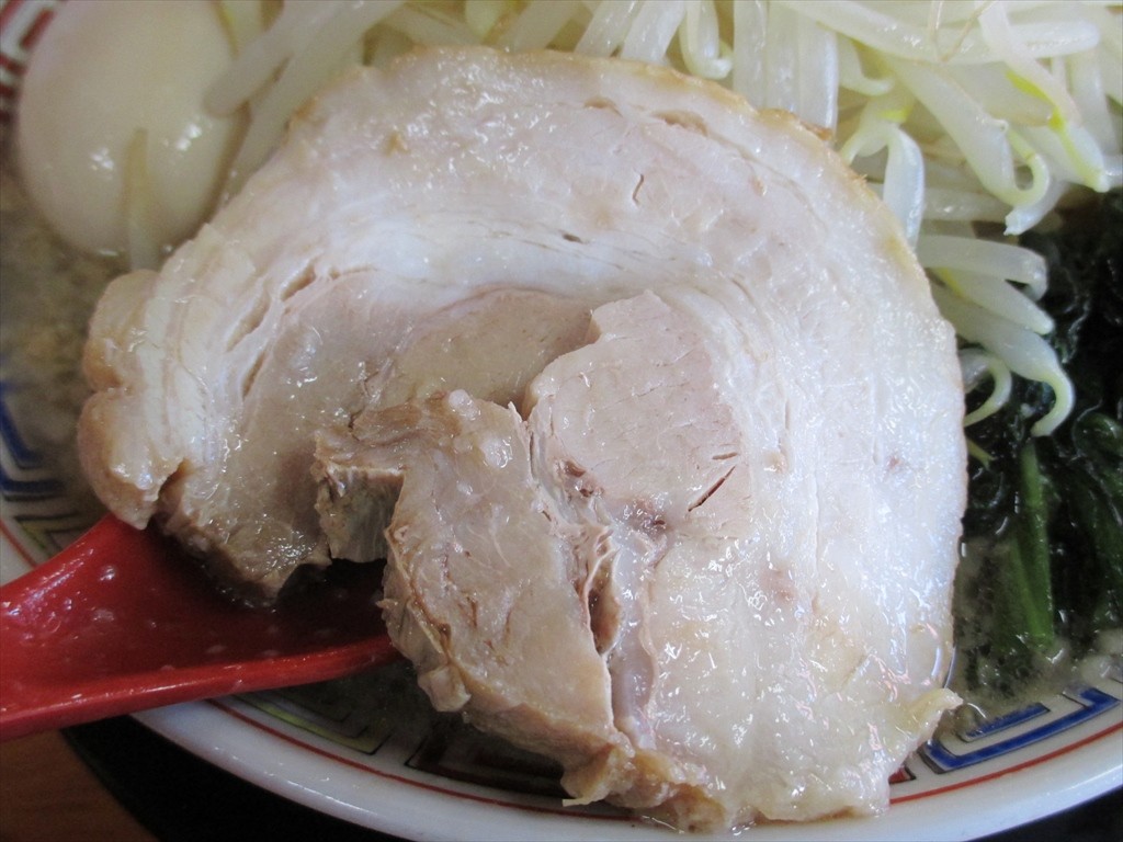 チャーシューは厚切りの大判巻きバラが1枚。しっとり柔らかでスープと一緒に食べると美味しかったです。