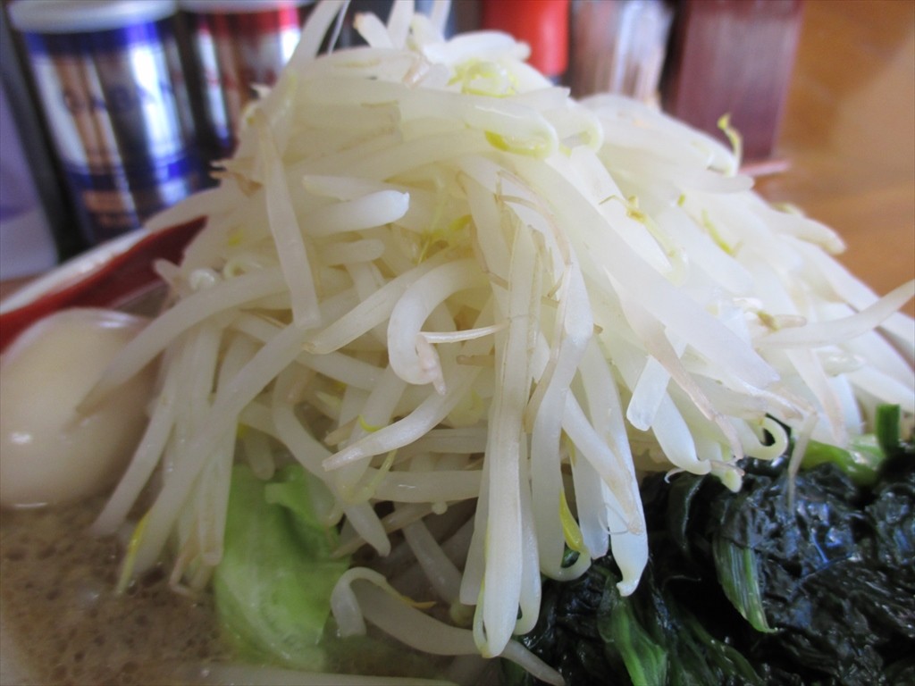 大盛り指定の野菜はもやしの山にキャベツは下層からちょいちょい顔を出してきました。