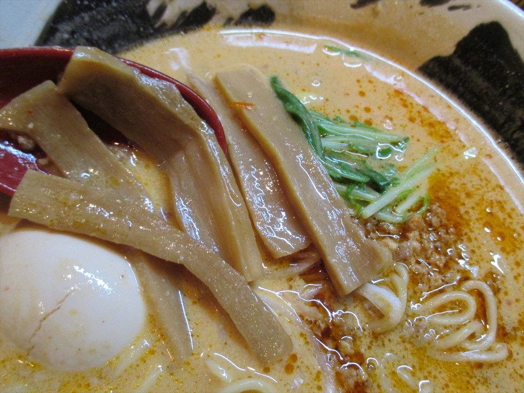 すこーしだけざらつきを感じるスープは白ゴマの風味が前面に立ちながらも清湯系であろうダシの旨みもきちん利いてて辛さの方はほんのちびっと舌を刺す程度。総じて飲みやすく後を引く味わいになってます。