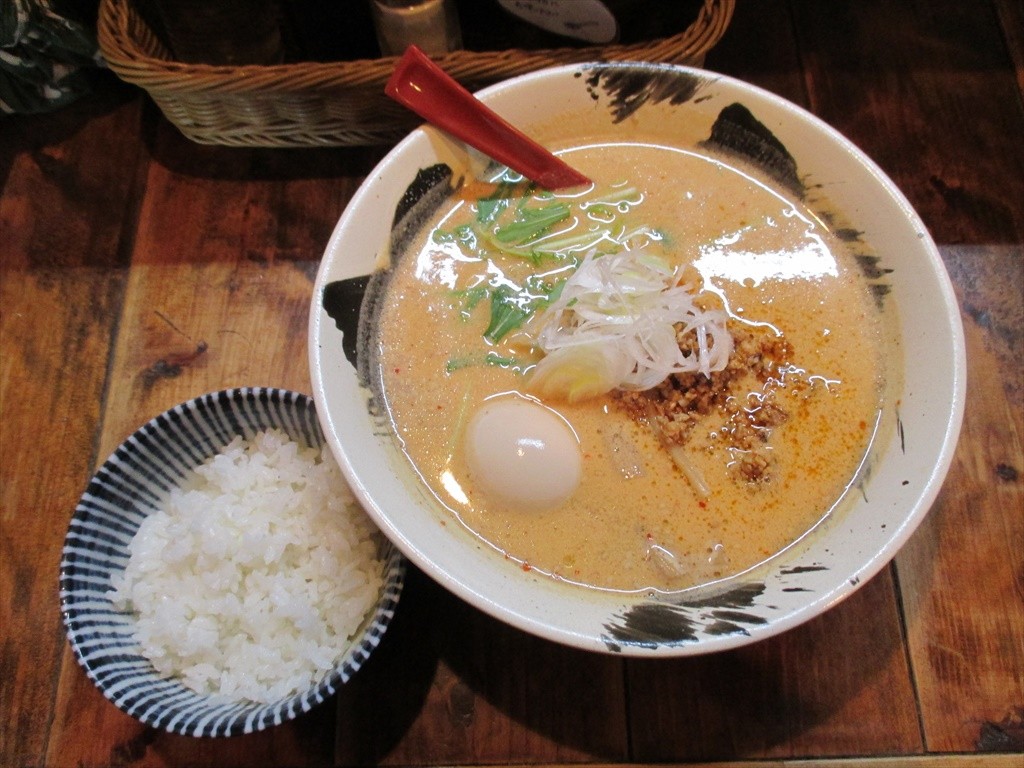 赤担々麺・細麺¥750+味付け玉子¥100+小ライス(ランチサービス)