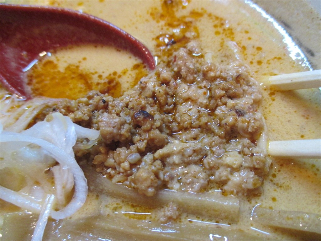 担々そぼろは甘めな味付けちょい辛め。これが溶け込んでいくとスープの厚みが増していきます。