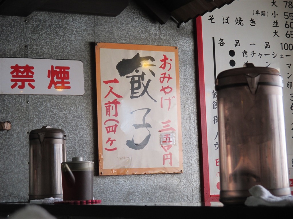 店頭にも出されるようになったメニュー。味噌を筆頭に記憶にある限りではあっさりの東京ラーメンとなんといっても名物は特大サイズのジャンボ餃子ですよね。