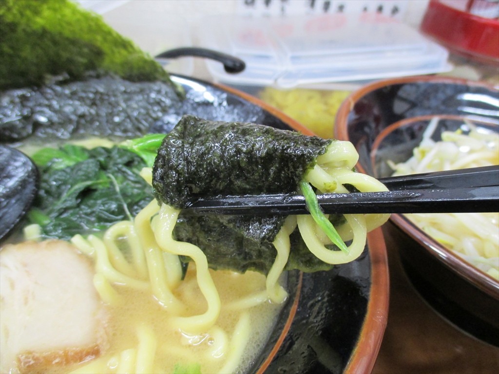 麺は中太平打ちストレート。ちょっとごわごわに思える固めな歯ごたえで短めが特徴の家系の麺としてもかなり短めに感じます。