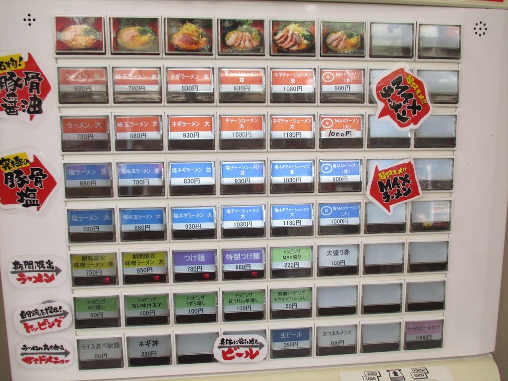 券売機上には写真入りメニューも。トッピングのカンジがつかめるのは親切ですね。