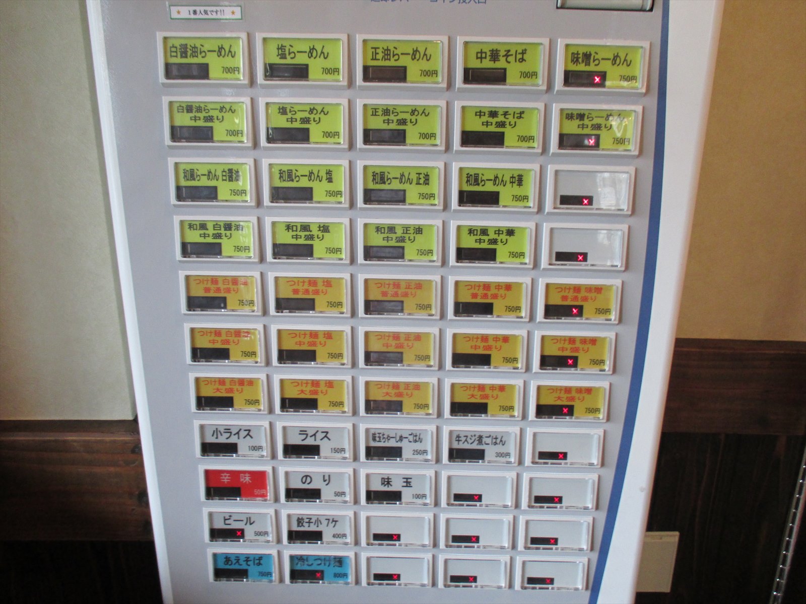 入って左にある券売機。うーん、やっぱり味噌は売り切れ表示かぁ。まま、未食なのがまだあるし味噌は本店で食べたからいいんだけどね。