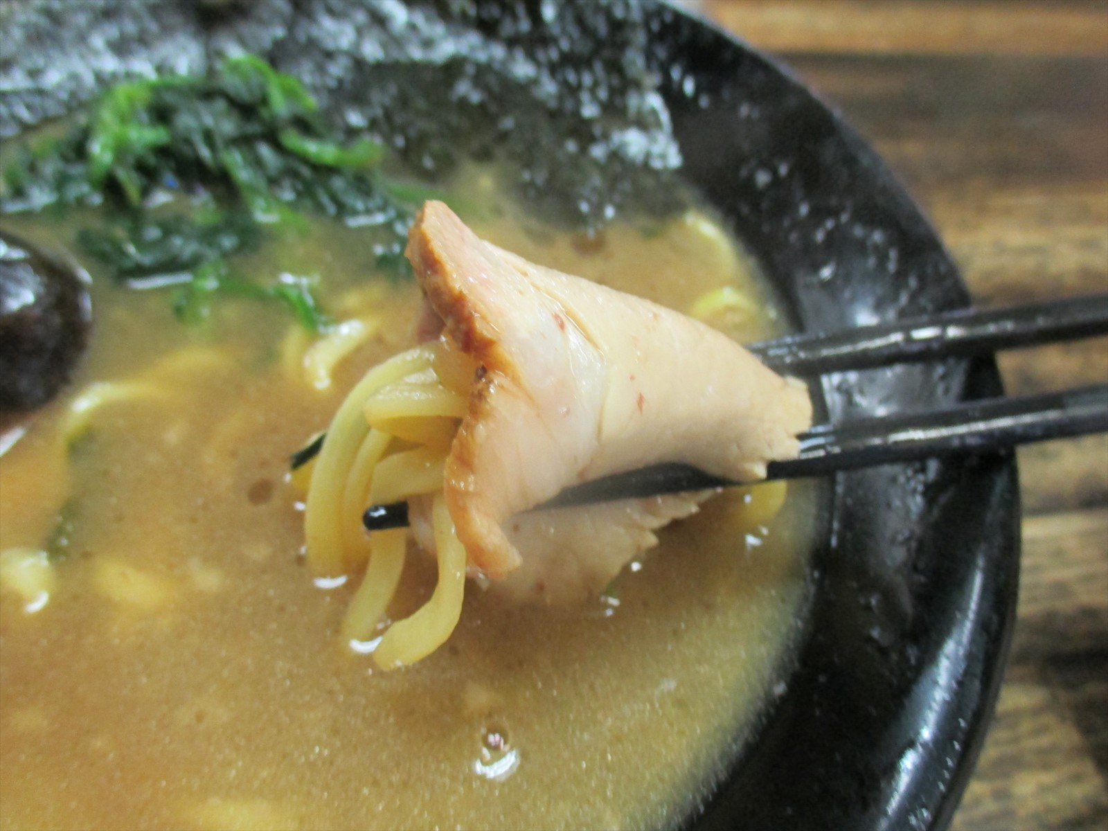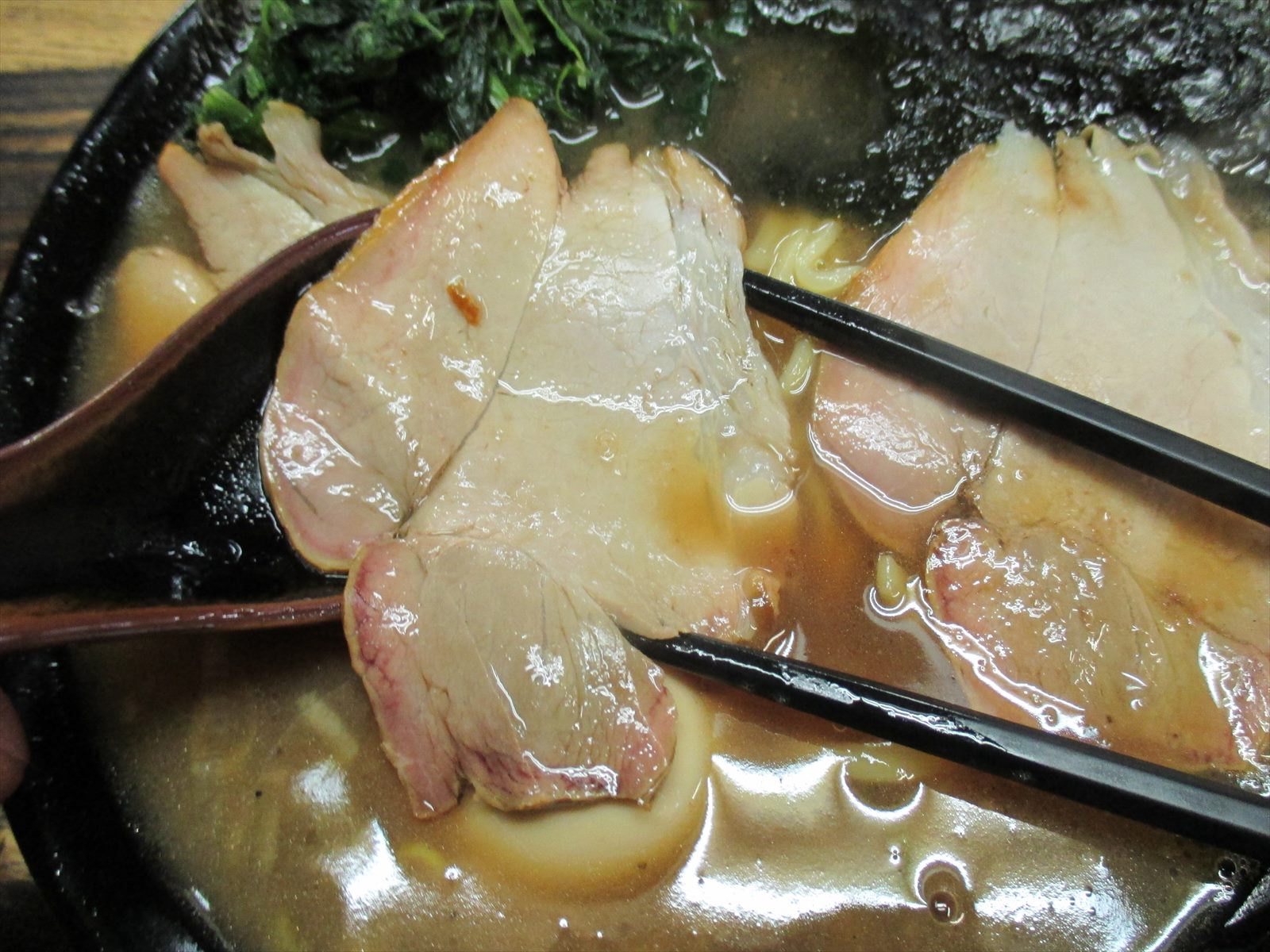 調子に乗ってチャーシューで麺を巻いちゃいます。いつまでも噛んでいたくなっちゃうじゃんか。