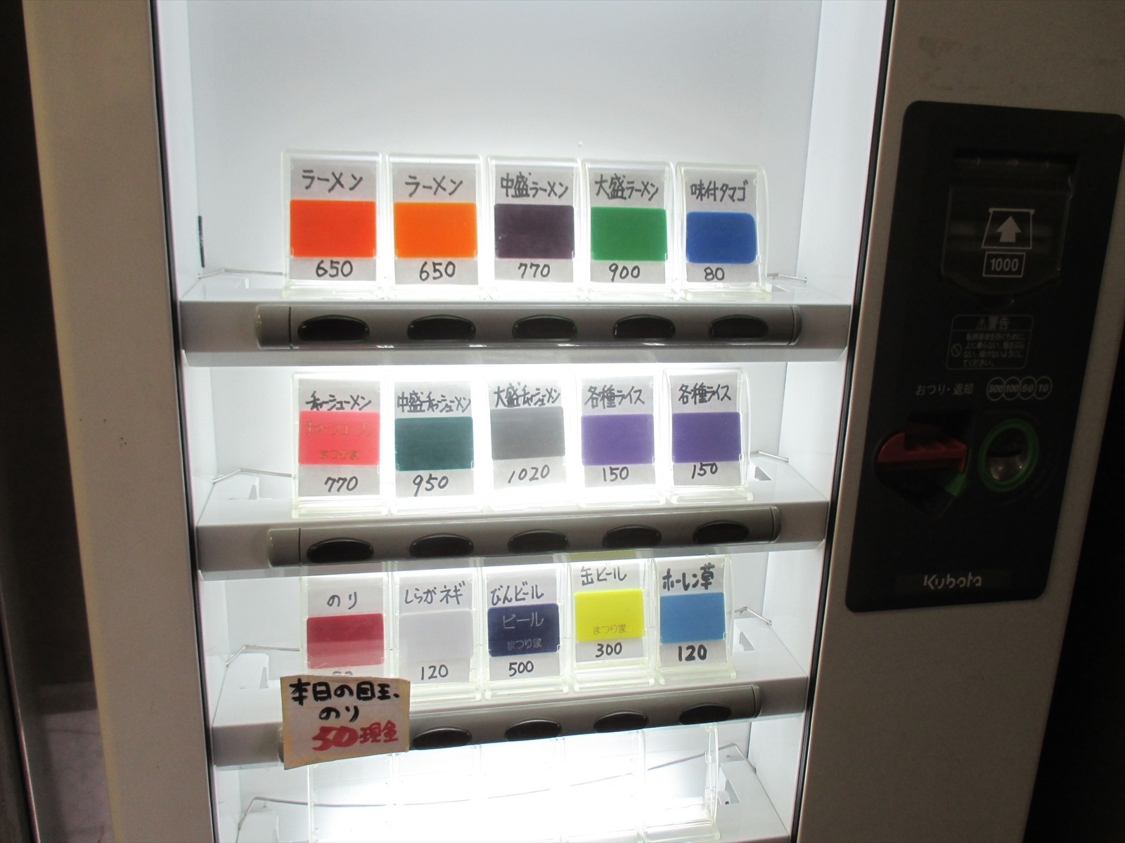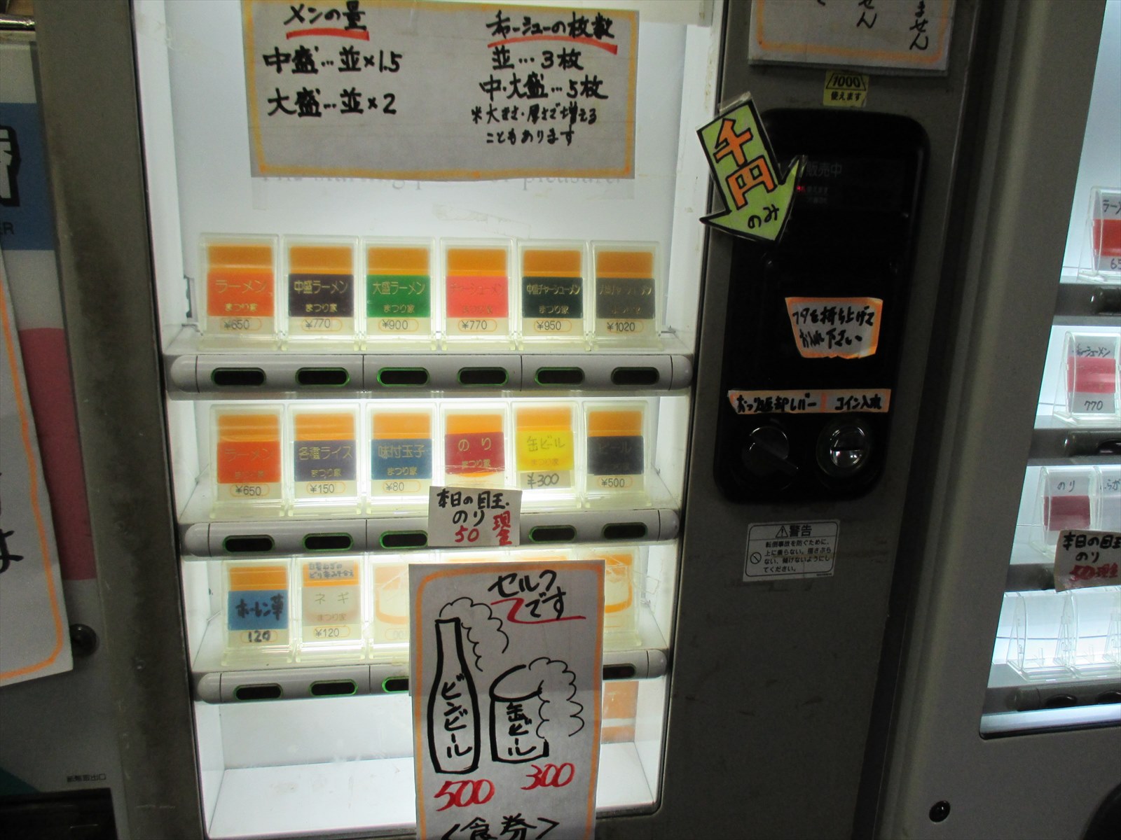 店内ウェイティングスペースにある券売機。前回訪問より3年半が経過しておりさすがに若干の値上げが見られますがそれでも昨今では良心的な値段設定です。