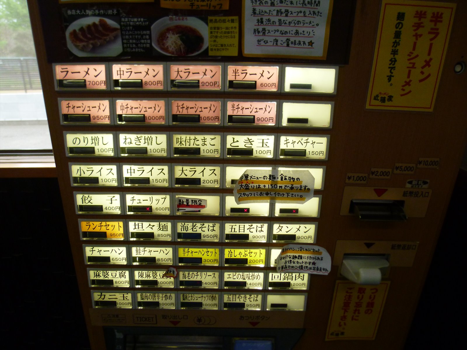 これも以前には無かった券売機で入って右手にあります。ラーメンとかそのへんはともかくとしてエビチリとかカニ玉とかが入ってる券売機もそうそうないような気がします。