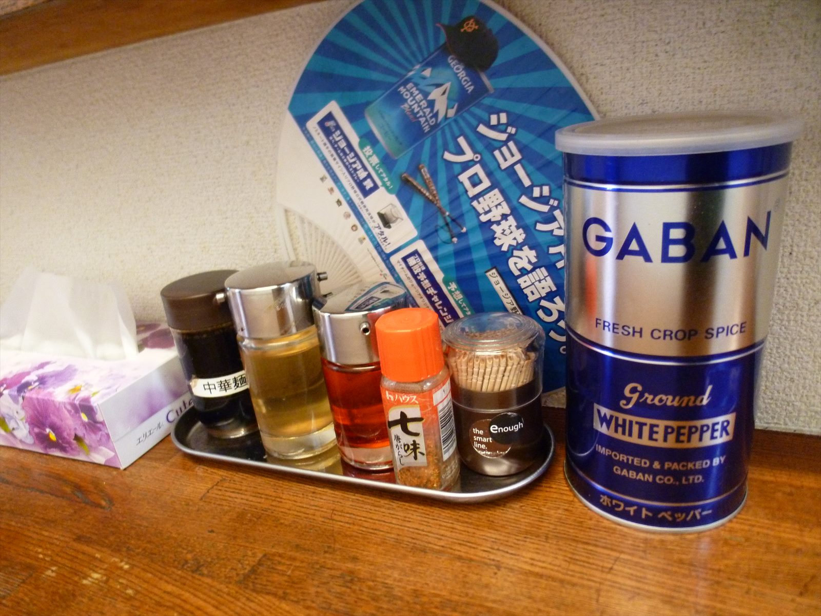 餃子どころかご飯もないので卓上調味料はすべてが麺用。醤油に見えるのもちゃんとタレです。