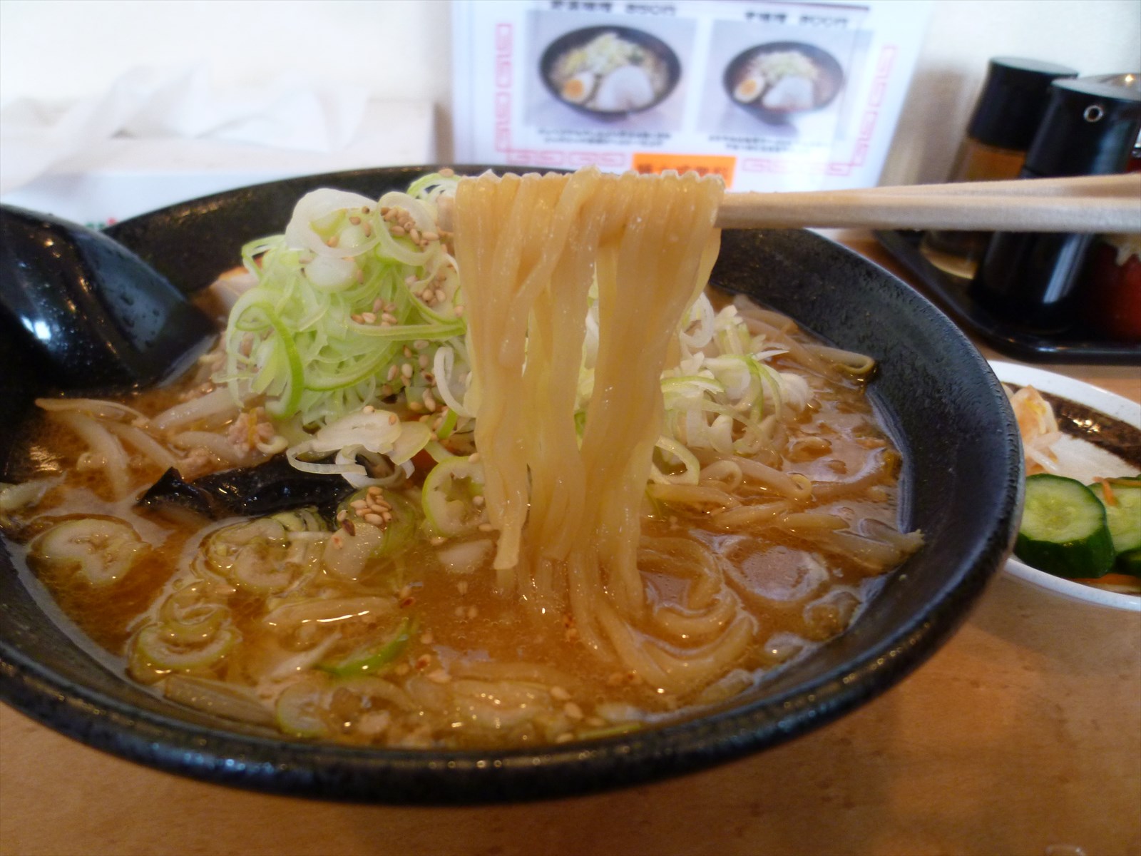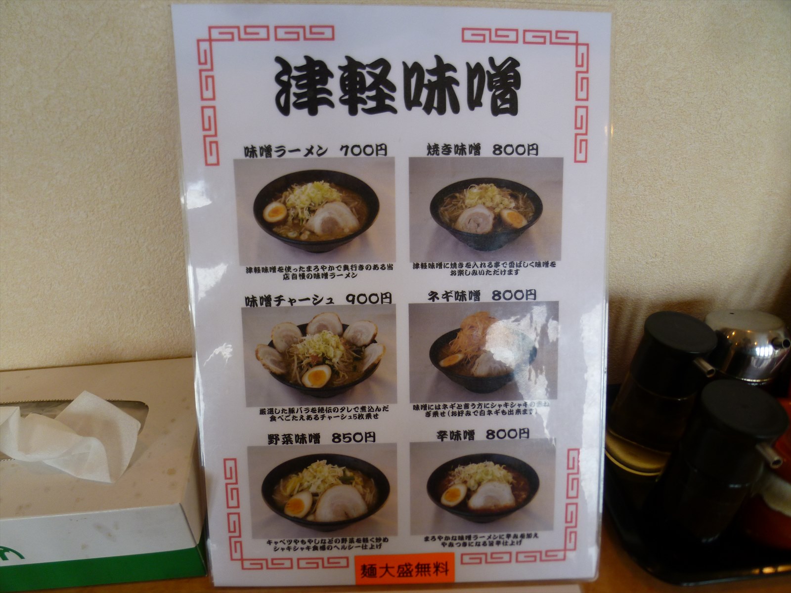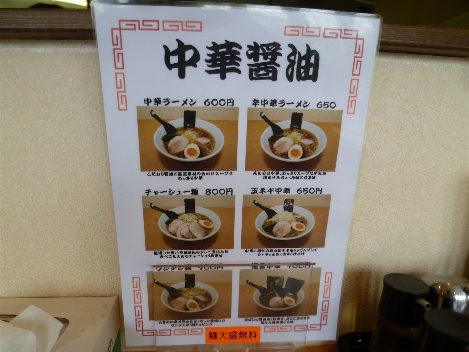 メニューは基本的に醤油と味噌。サイドには餃子とチャーシュー丼でわりかしシンプルな構成に思います。ちなみに麺類は大盛り無料のサービスがあり注文時に丁寧に訊いてくれます。